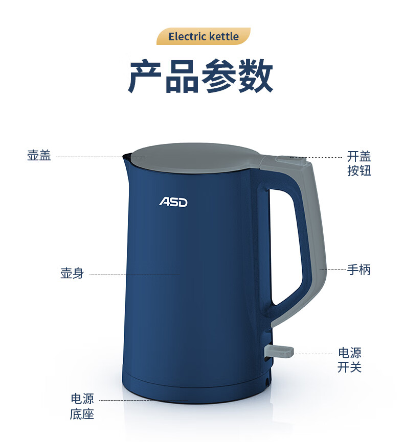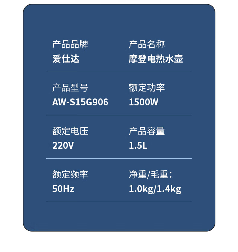 商品名称:爱仕达摩登电热水壶/AW-S15G906(单位:台) 蓝色