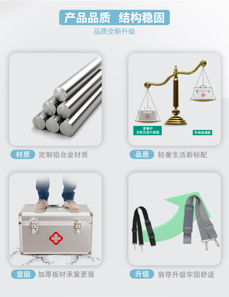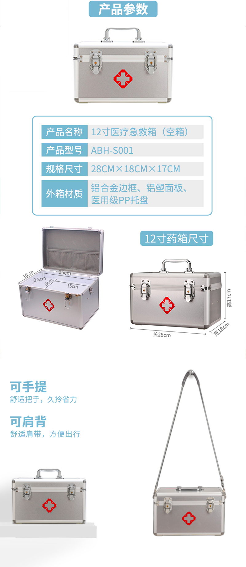 商品名称:爱备护 收纳箱 12寸医药箱 铝合金手提 ABH-S001(空箱) 28cm×18cm×17cm 金属银 铝合金边框、铝塑面板 银色