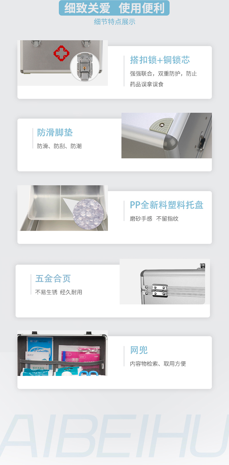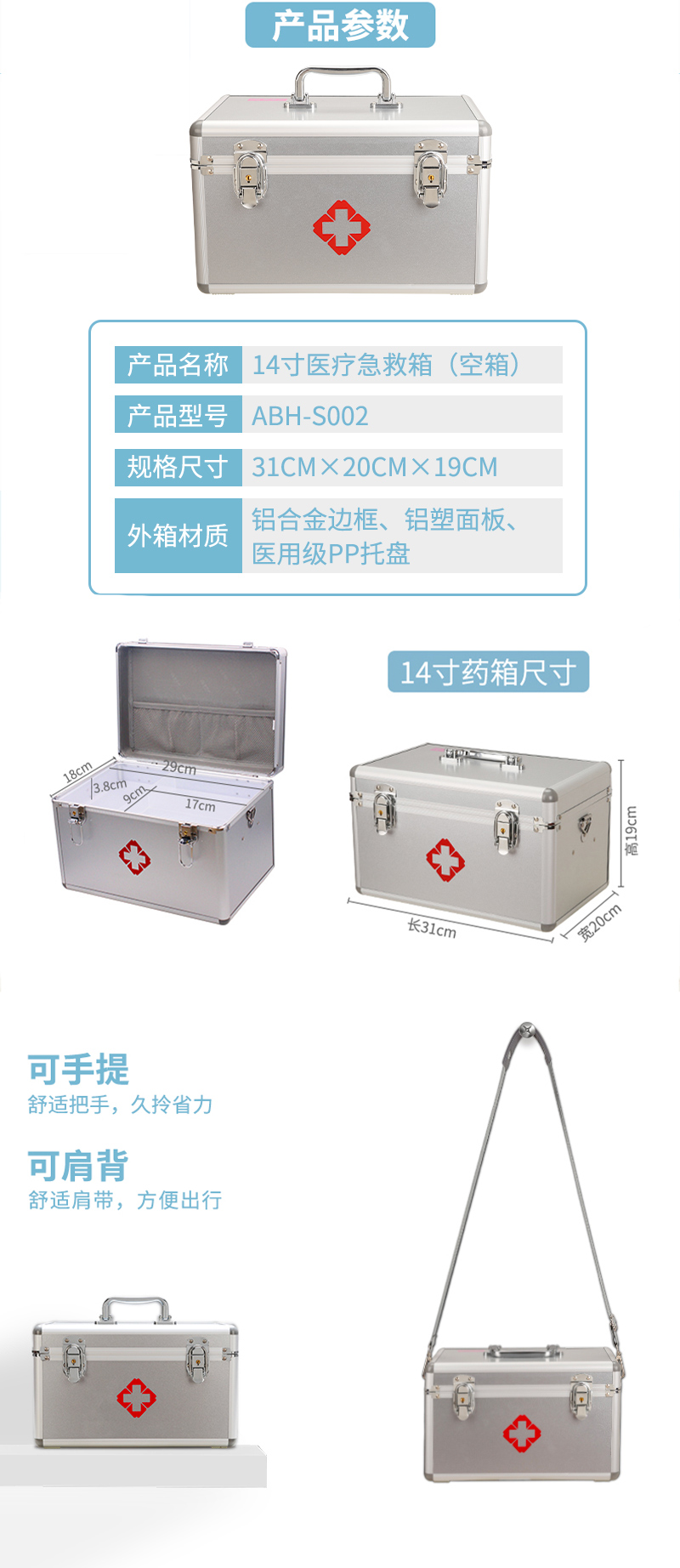 商品名称:爱备护 收纳箱 14寸医药箱 铝合金手提 ABH-S002(空箱) 31cm×20cm×19cm 金属银 铝合金边框、铝塑面板 银色