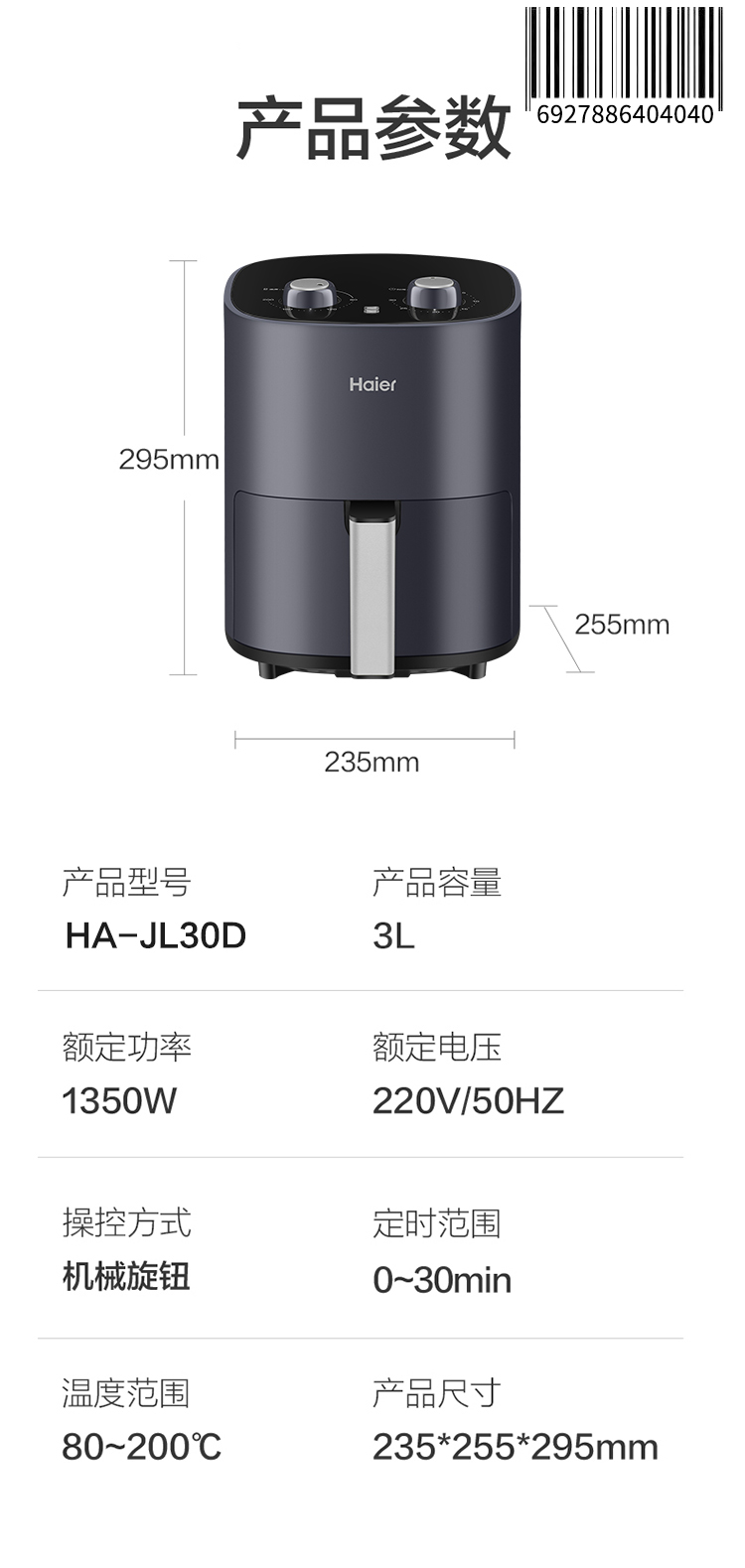 商品名称:海尔(Haier)空气炸锅HA-JL30D 3L (单位:台) 灰色