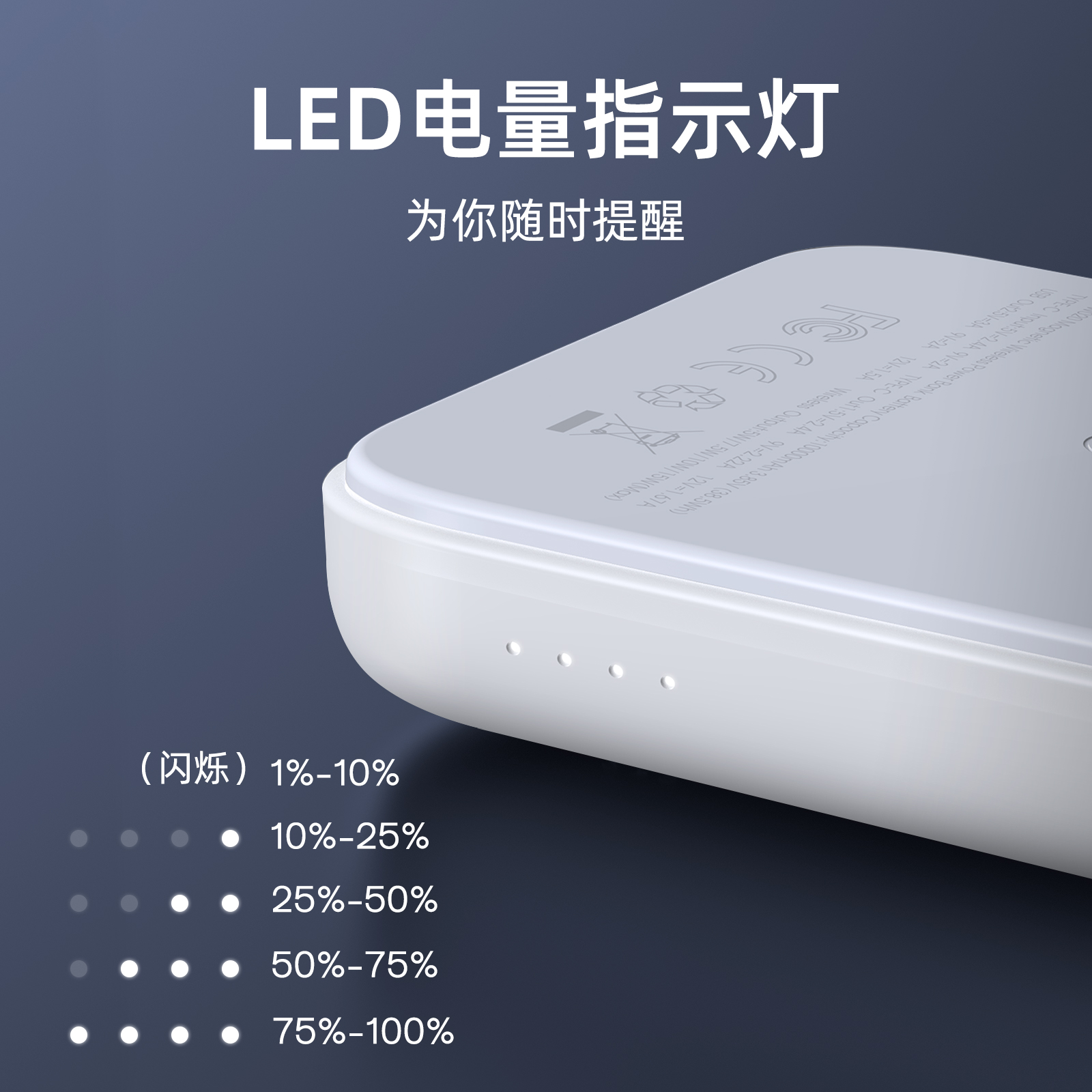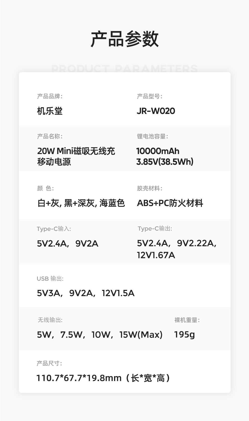 商品名称:机乐堂J磁吸无线充移动电源JR-W020(单位:个) 白+灰 10000毫安