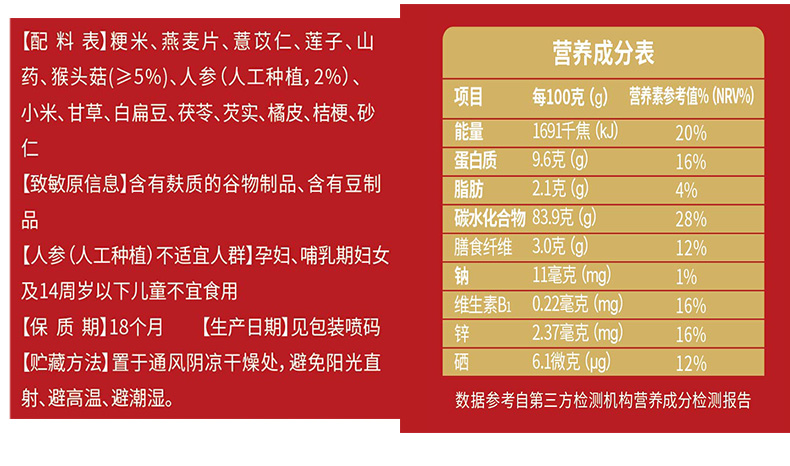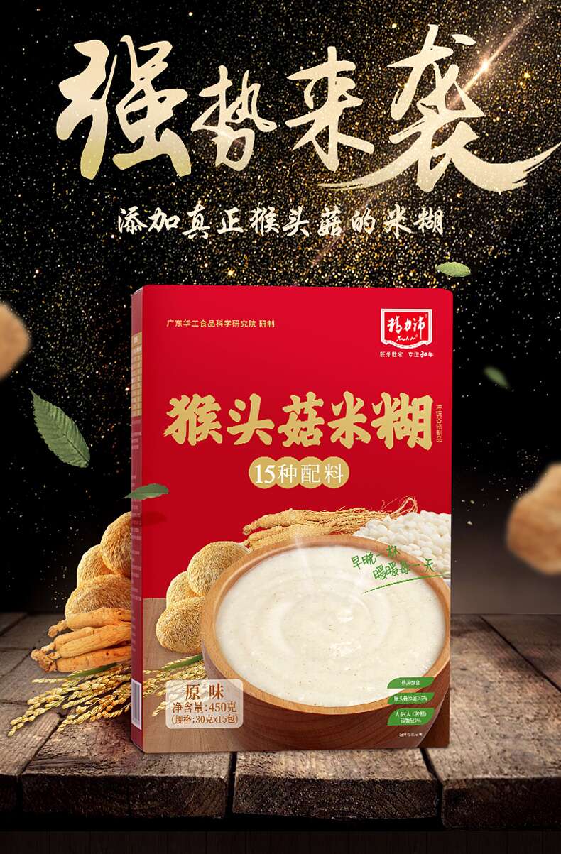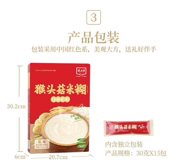 商品名称:精力沛即食早餐谷物原味无加蔗糖猴头菇米糊450g(30g*15包)盒 红色