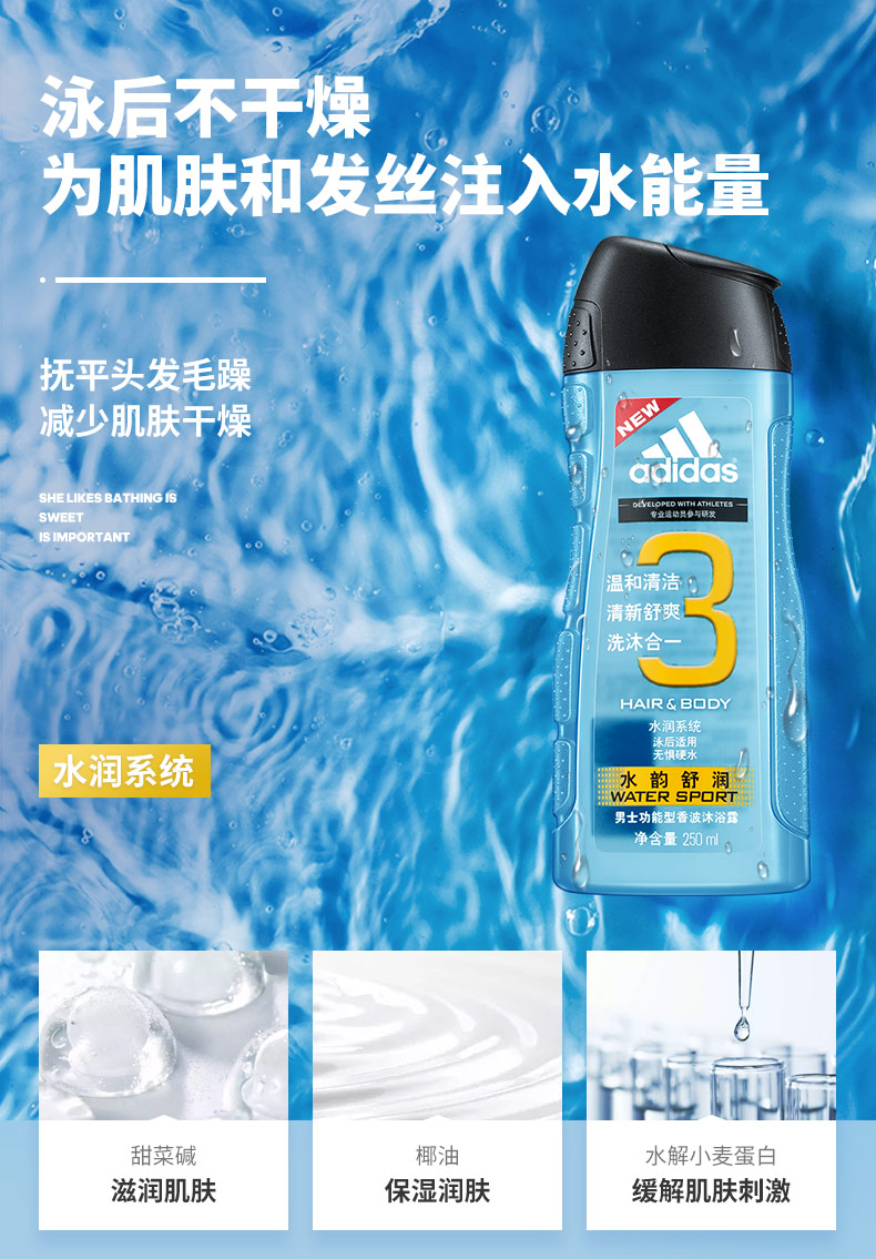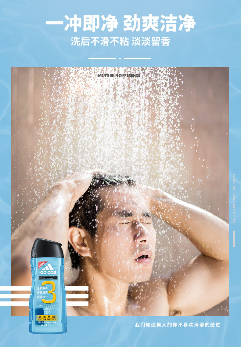 商品名称:阿迪达斯男士功能型香波沐浴露—水韵舒润250ml 婴儿蓝