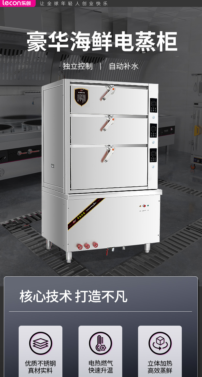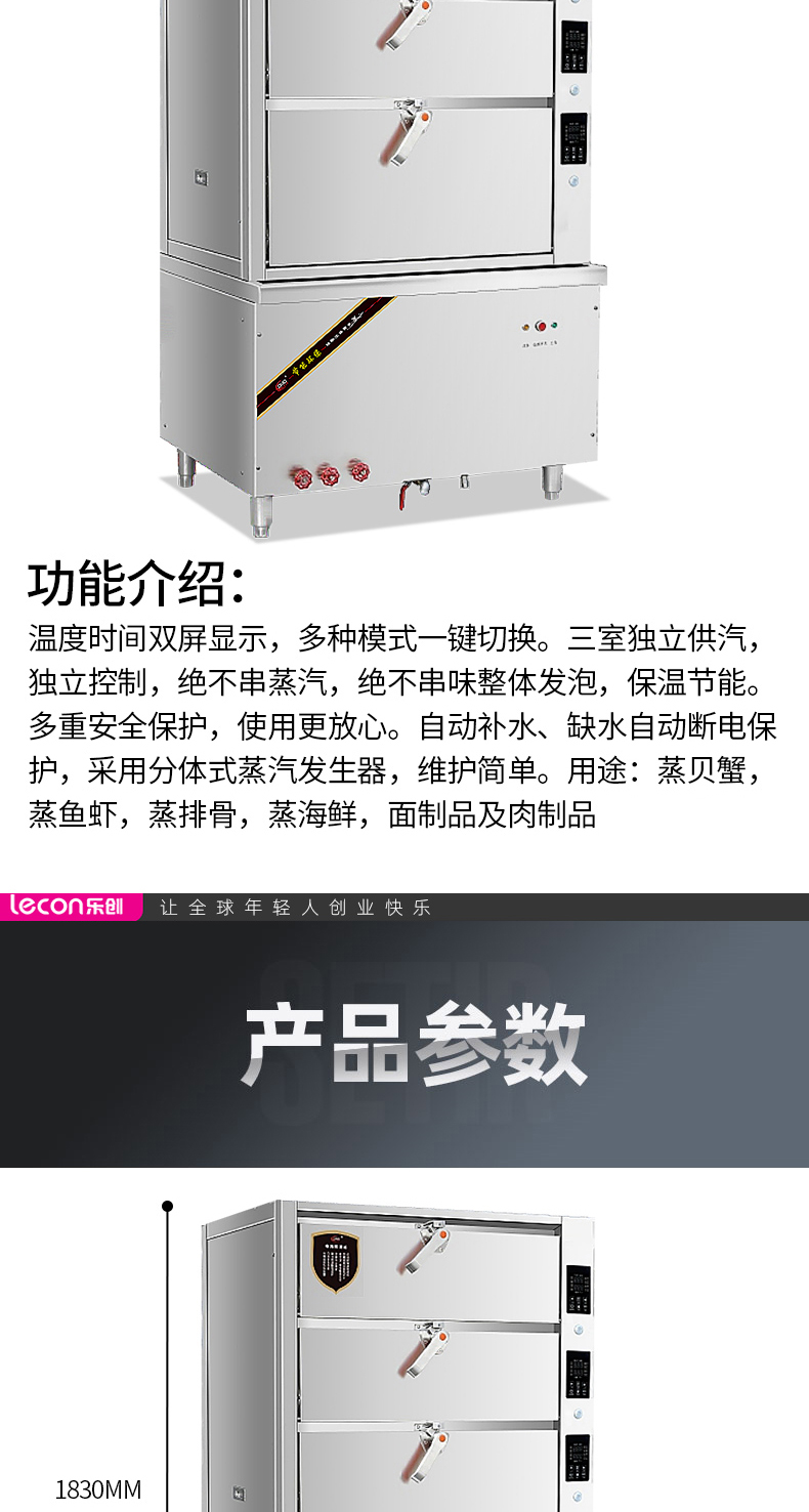 商品名称:乐创( lecon) 商用海鲜蒸柜 食堂酒店三门海鲜蒸柜电磁 豪华款 LC-J-HXD3X单位:台 不锈钢色