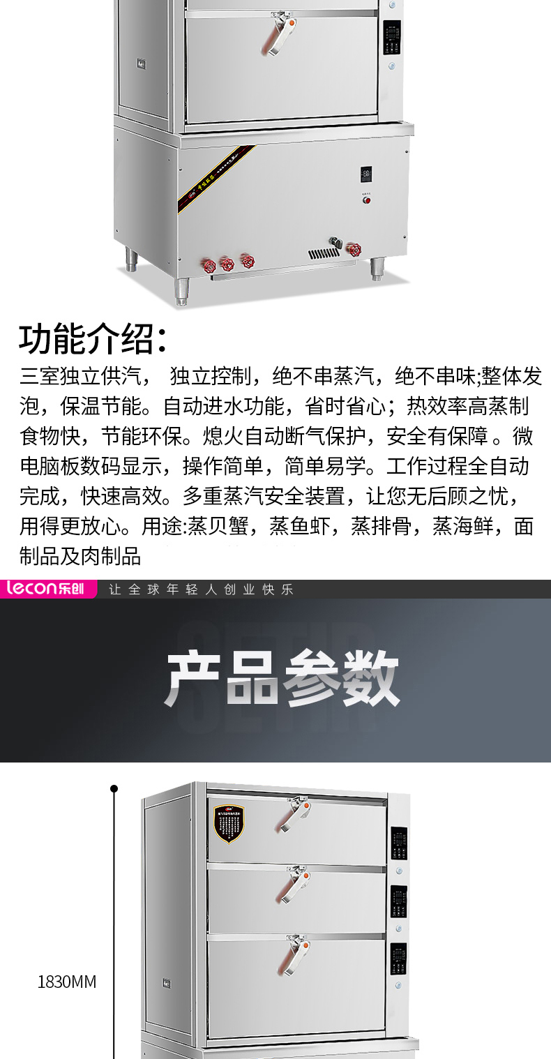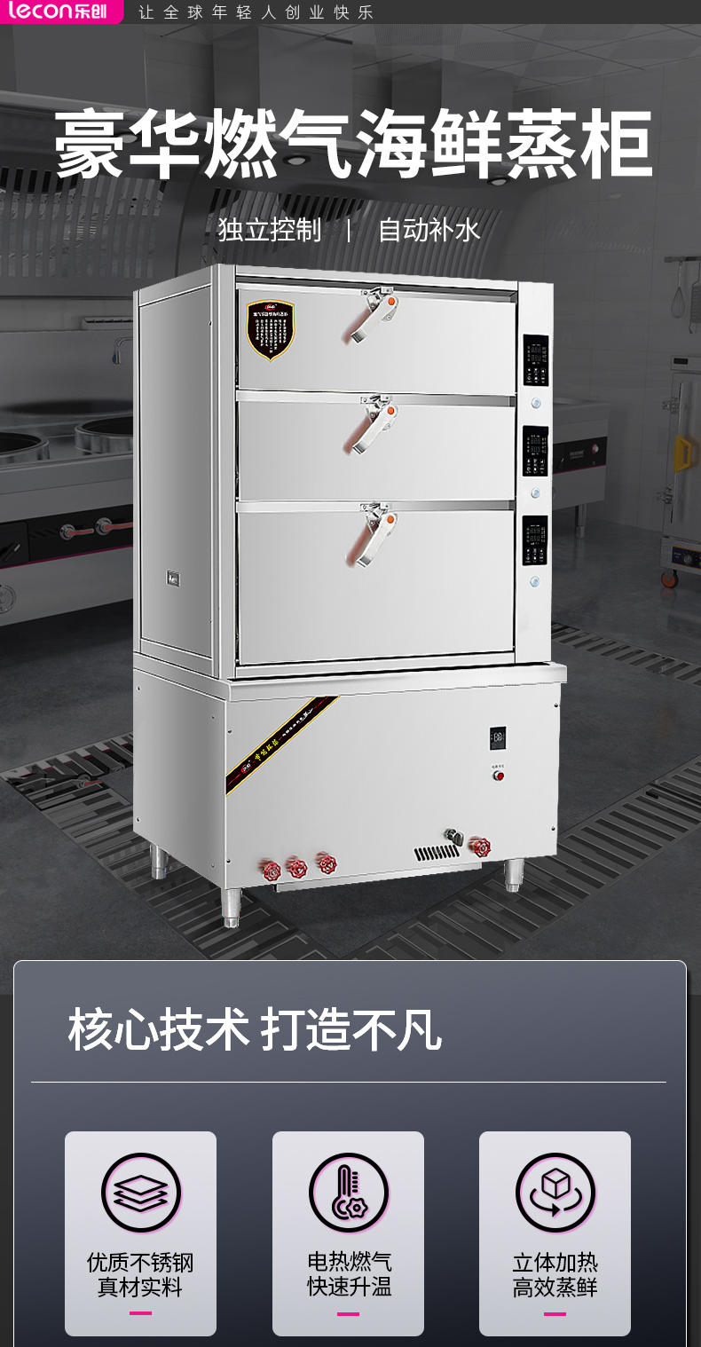 商品名称:乐创( lecon) 商用海鲜蒸柜 食堂酒店三门海鲜蒸柜燃气 豪华款 LC-J-HXR3D 不锈钢色