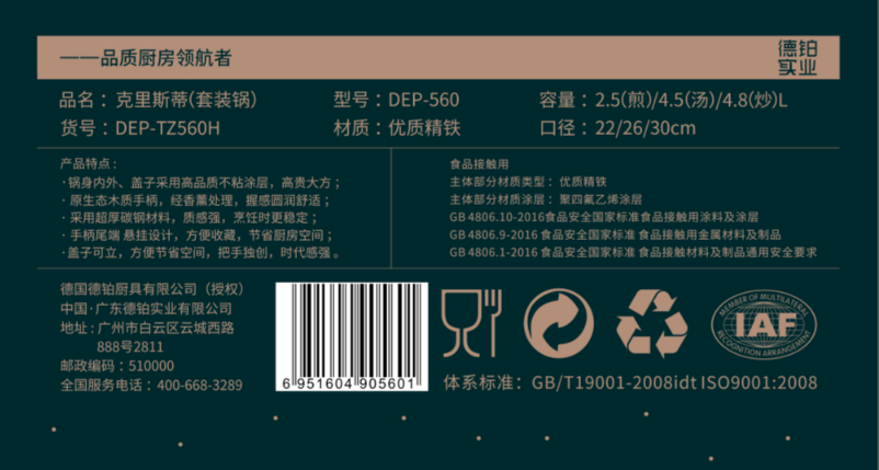 商品名称:Debo(德铂)克里斯蒂套装锅22/26/30cm DEP-560 (单位:套) 三件套 黑色
