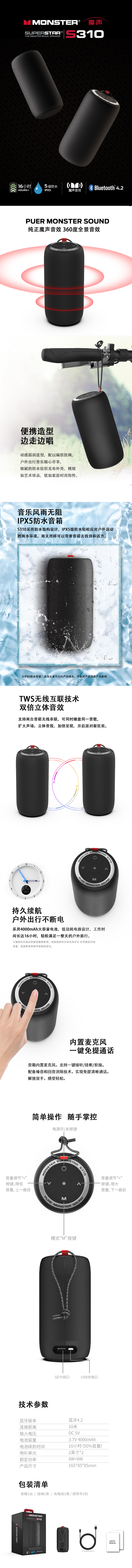 商品名称:魔声 S310便携式无线蓝牙音箱MS11902立体声(单位:个)黑色 黑色
