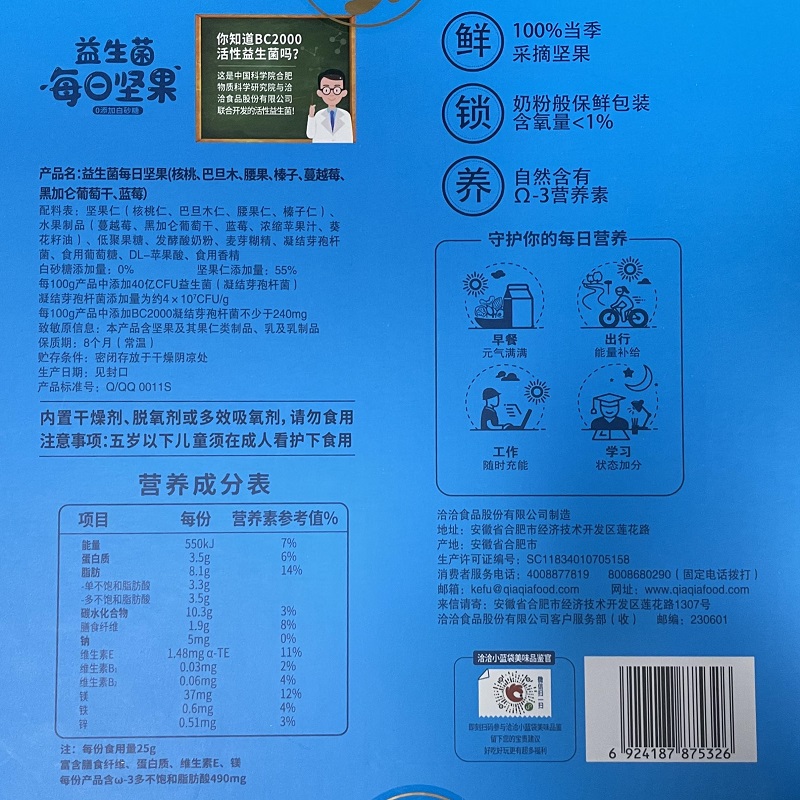 商品名称:洽洽益生菌每日坚果30日装750g 盒 蓝色