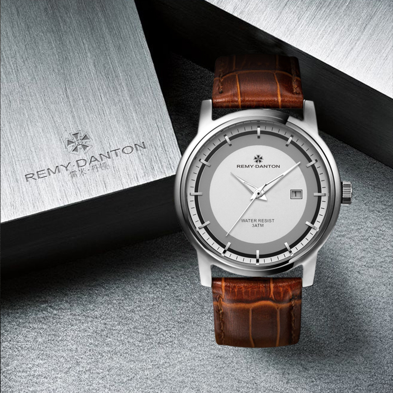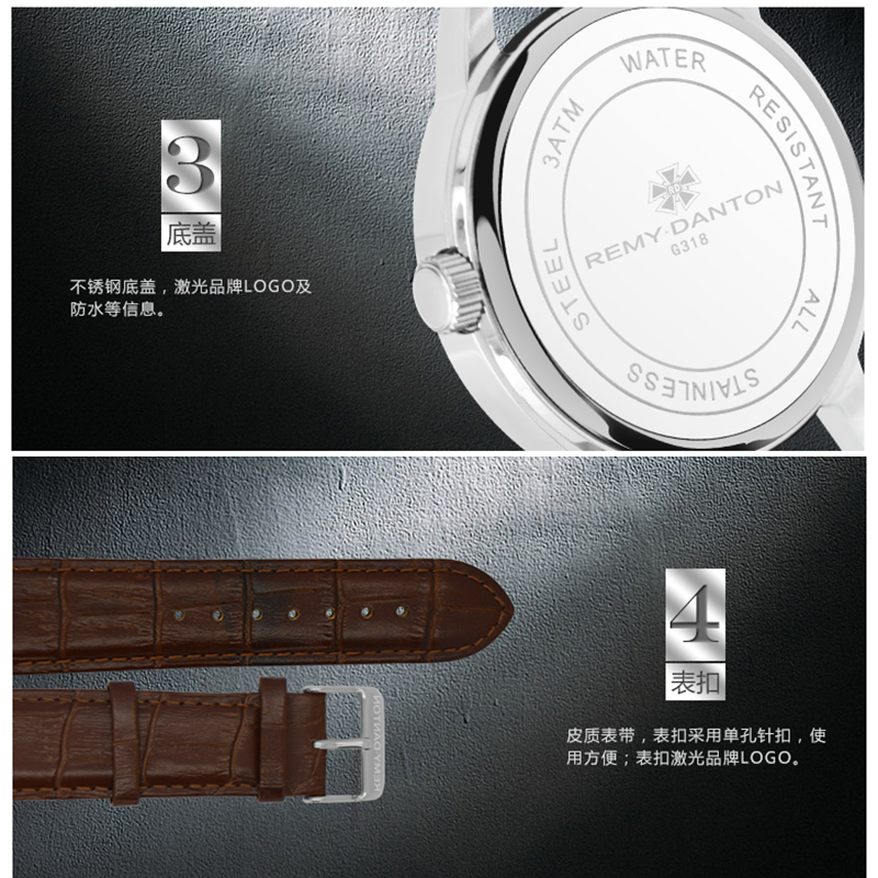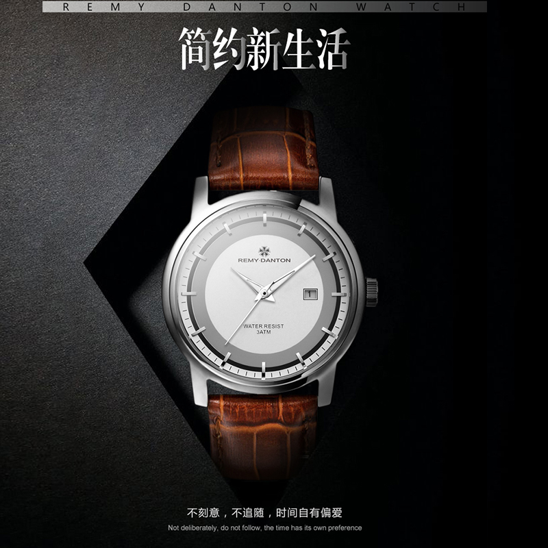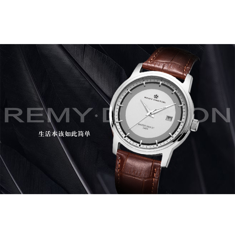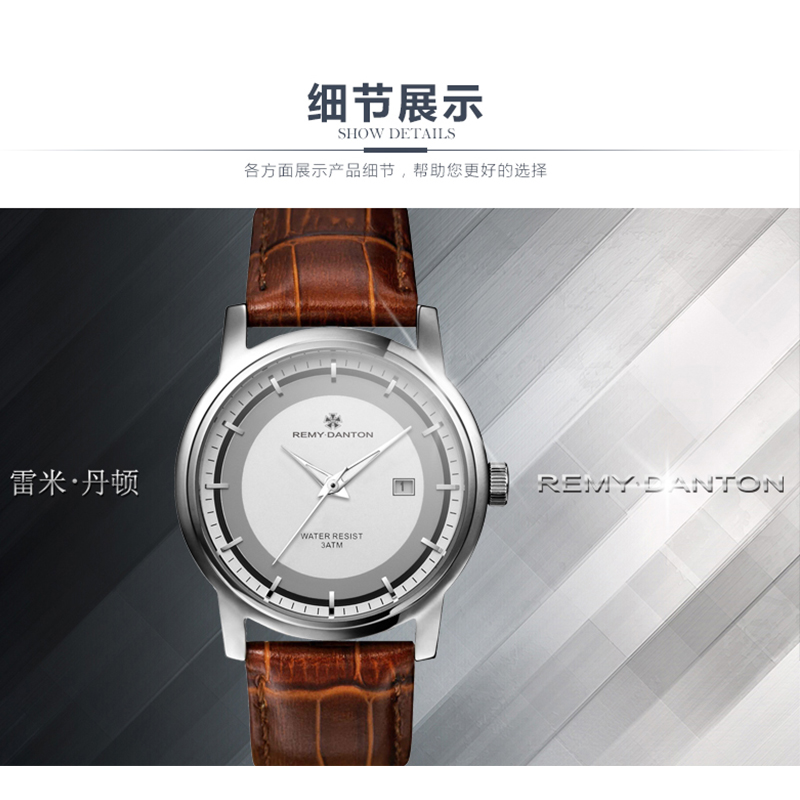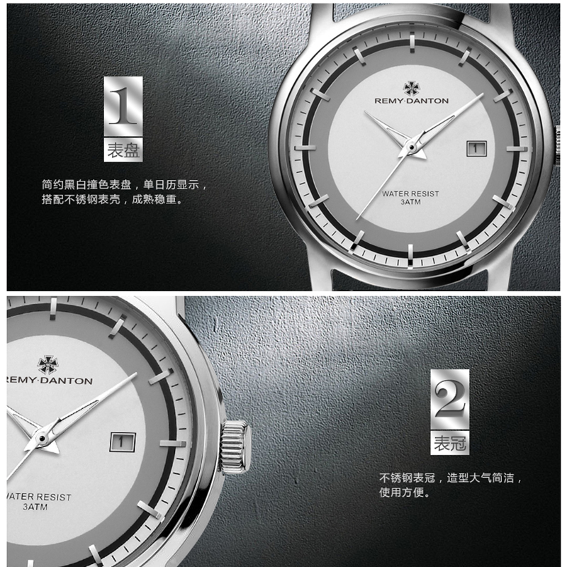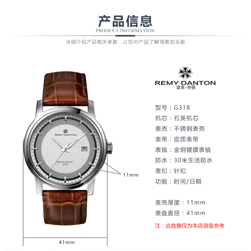 商品名称:雷米丹顿(REMY DANTON)正品夜光表石英表男表商务休闲时尚钢带防水腕表单日历男士手表 318.01.06银壳白面色棕皮带