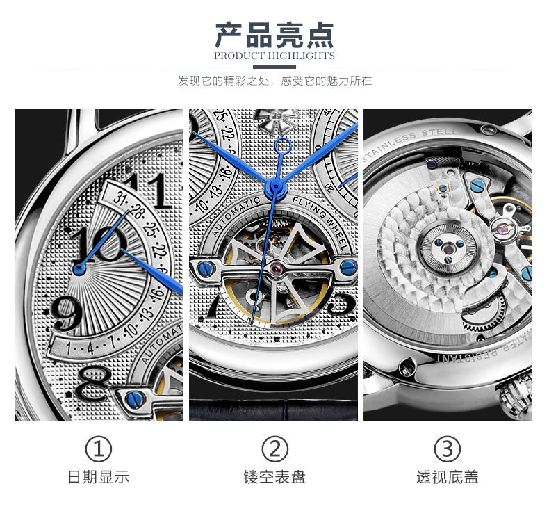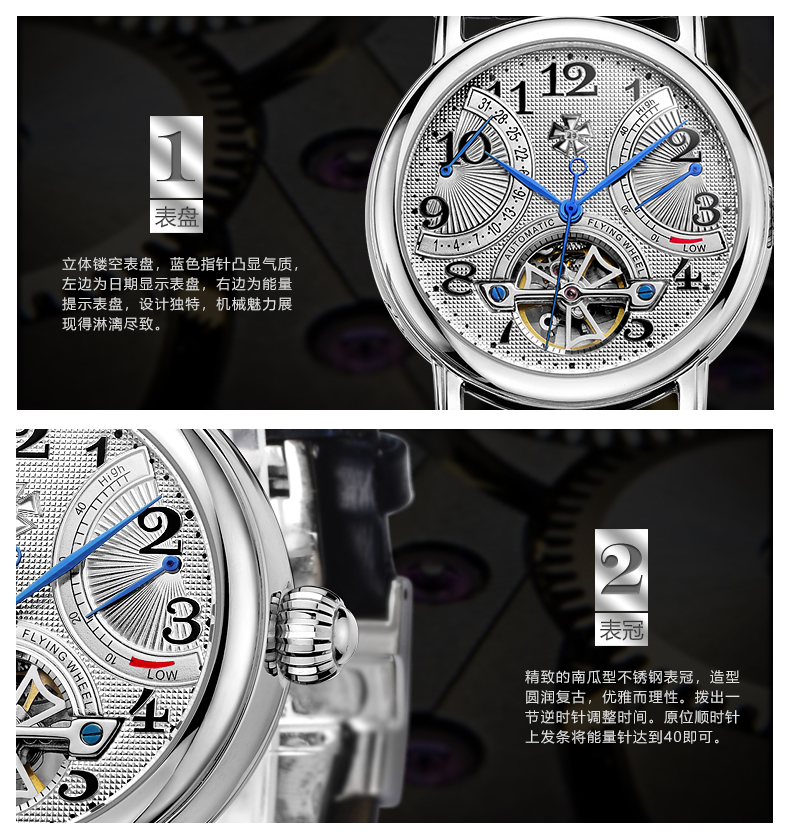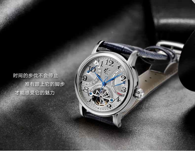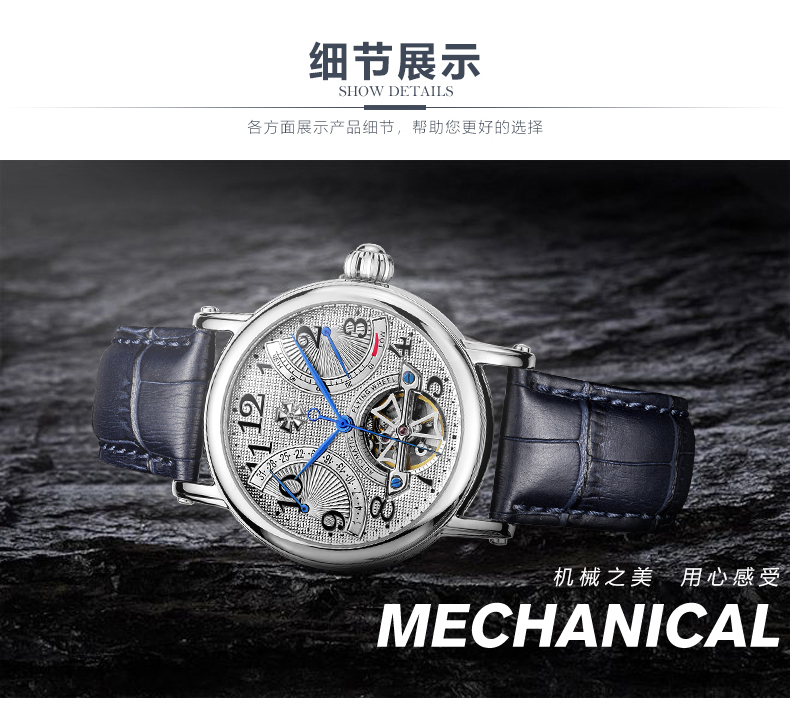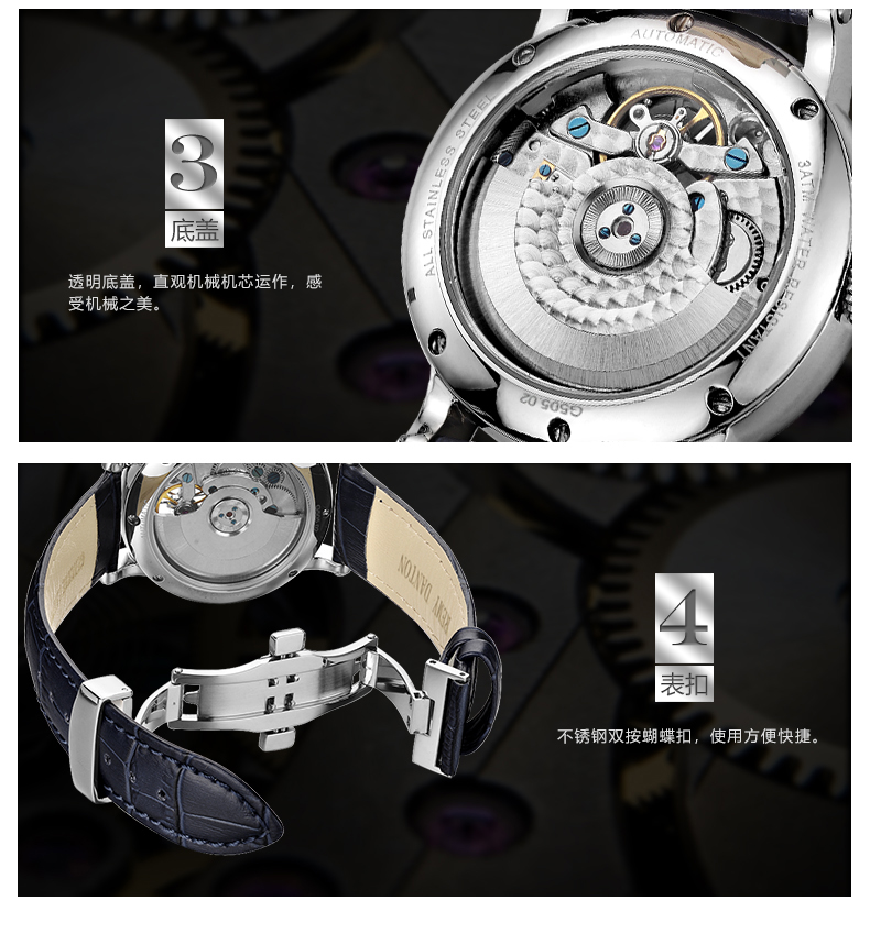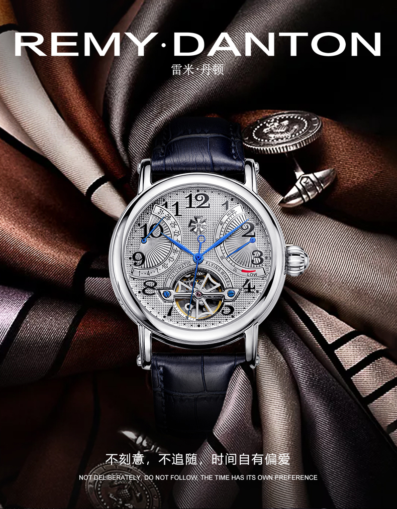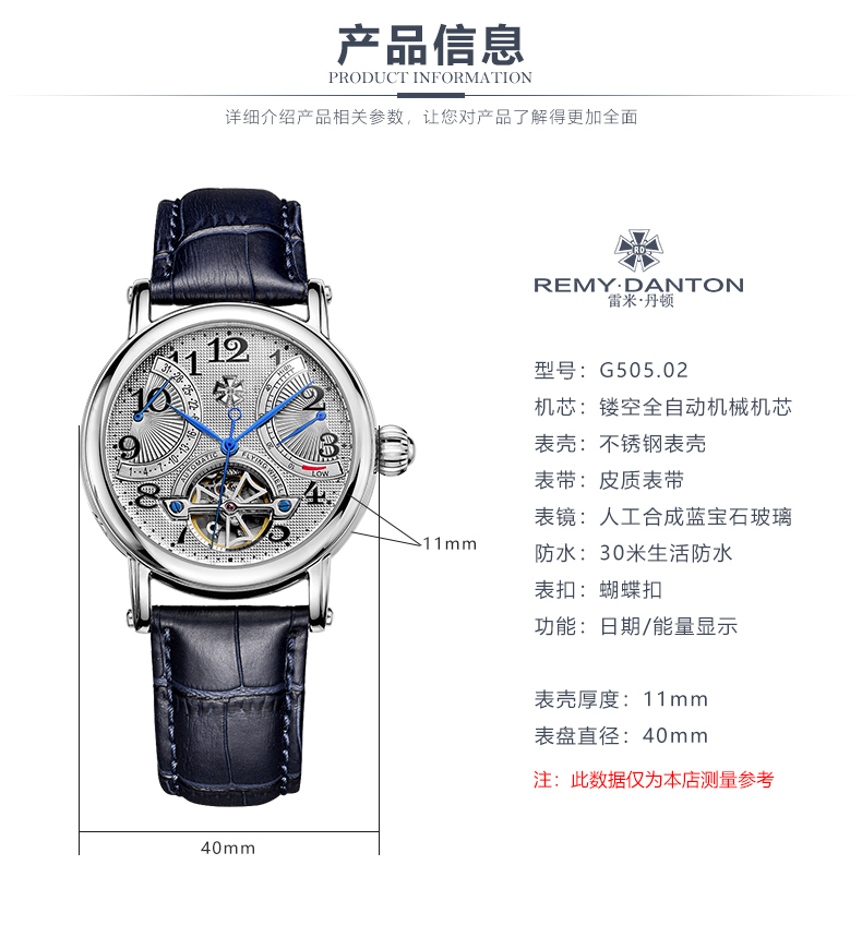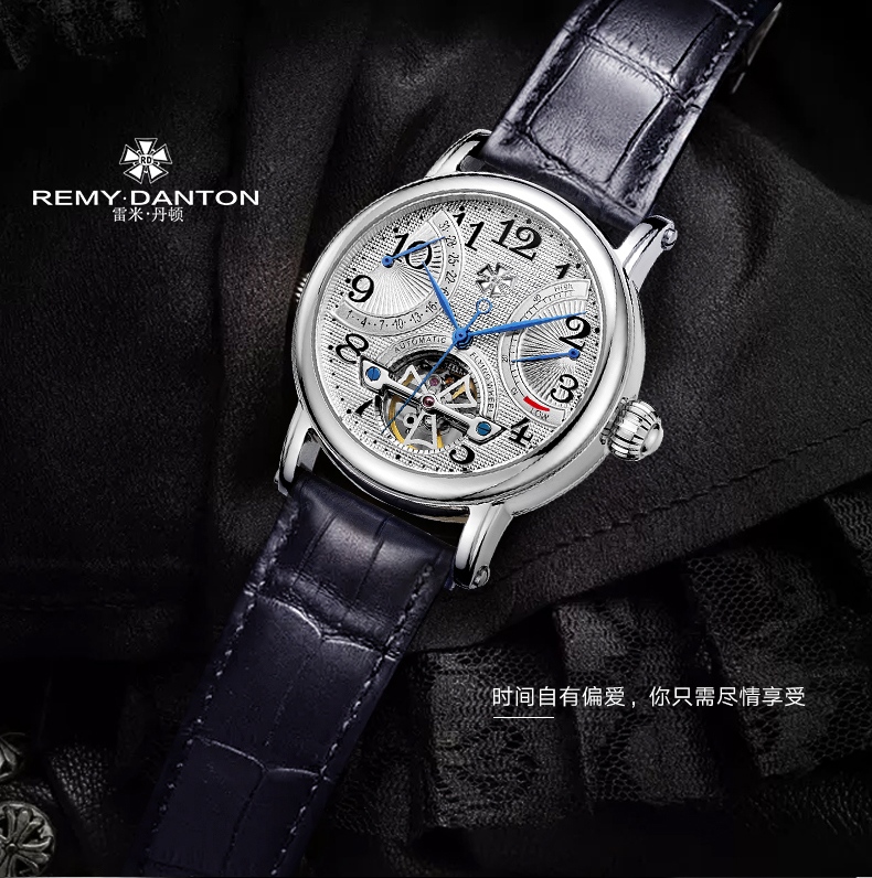 商品名称:雷米丹顿(REMY DANTON)正品全自动镂空机械表商务日历男士手表真皮简约腕表G505.02 黑色银壳