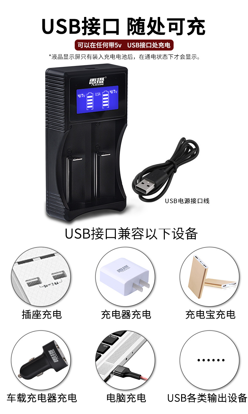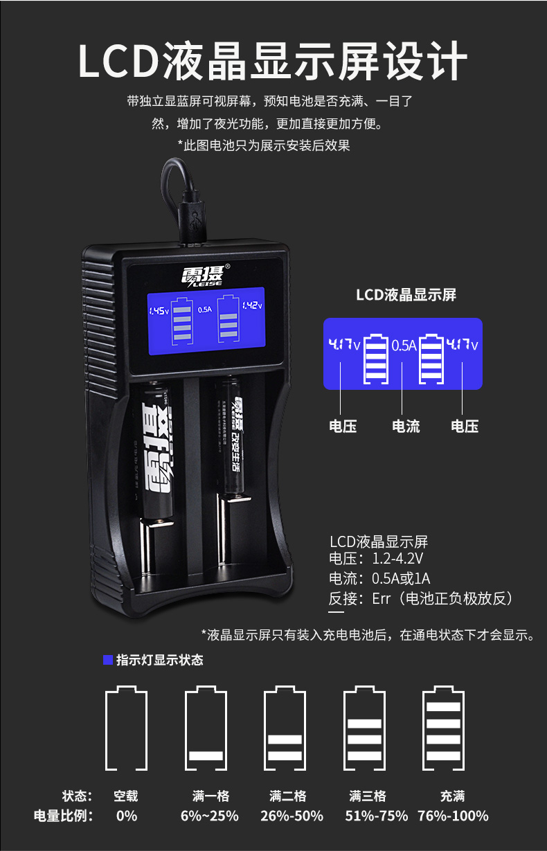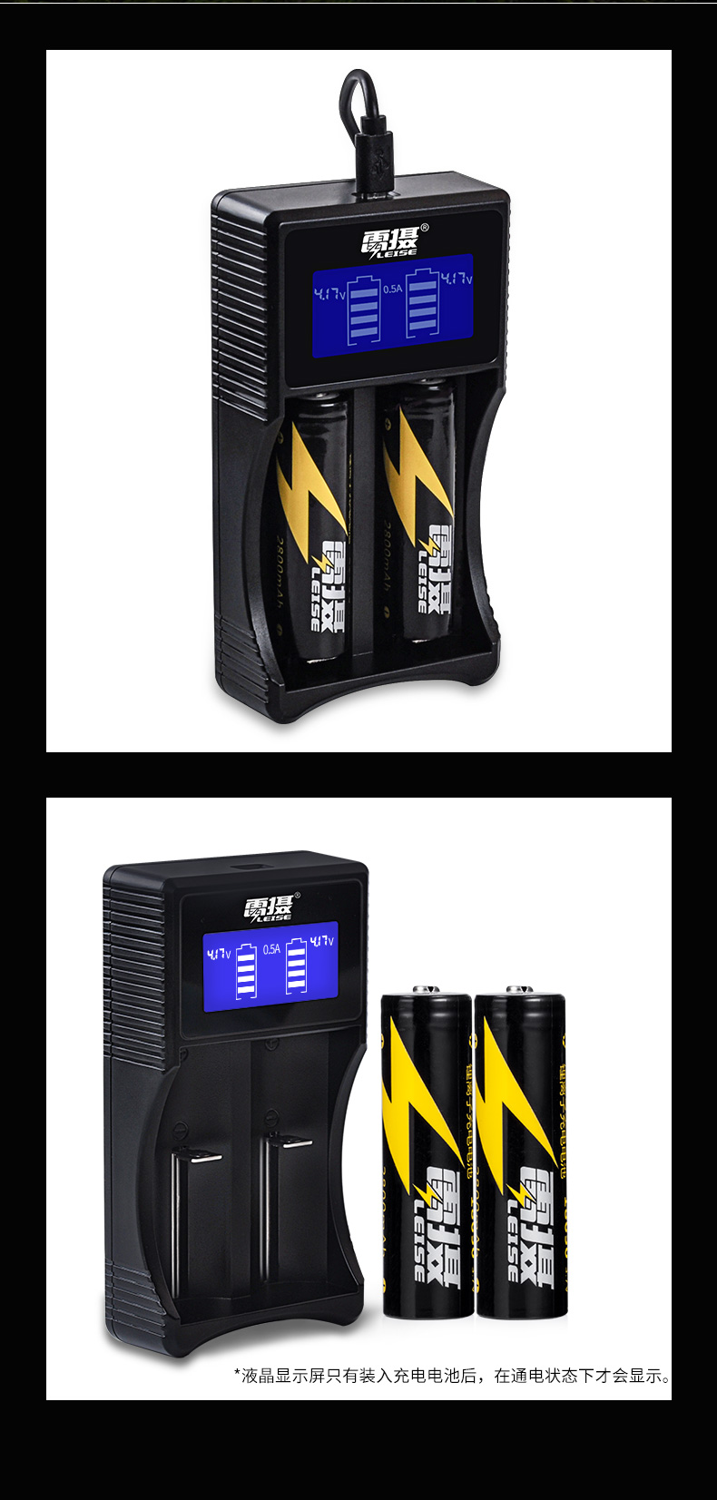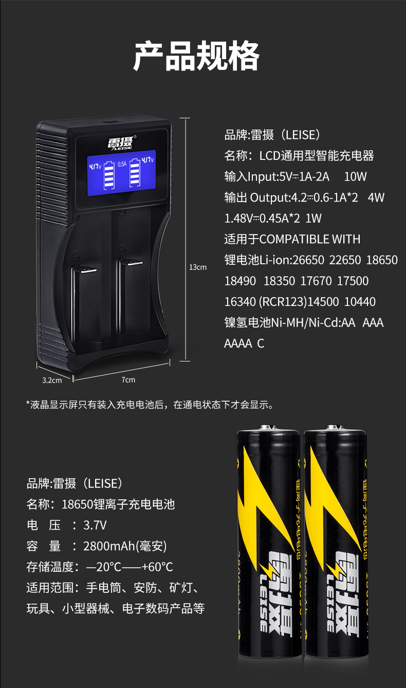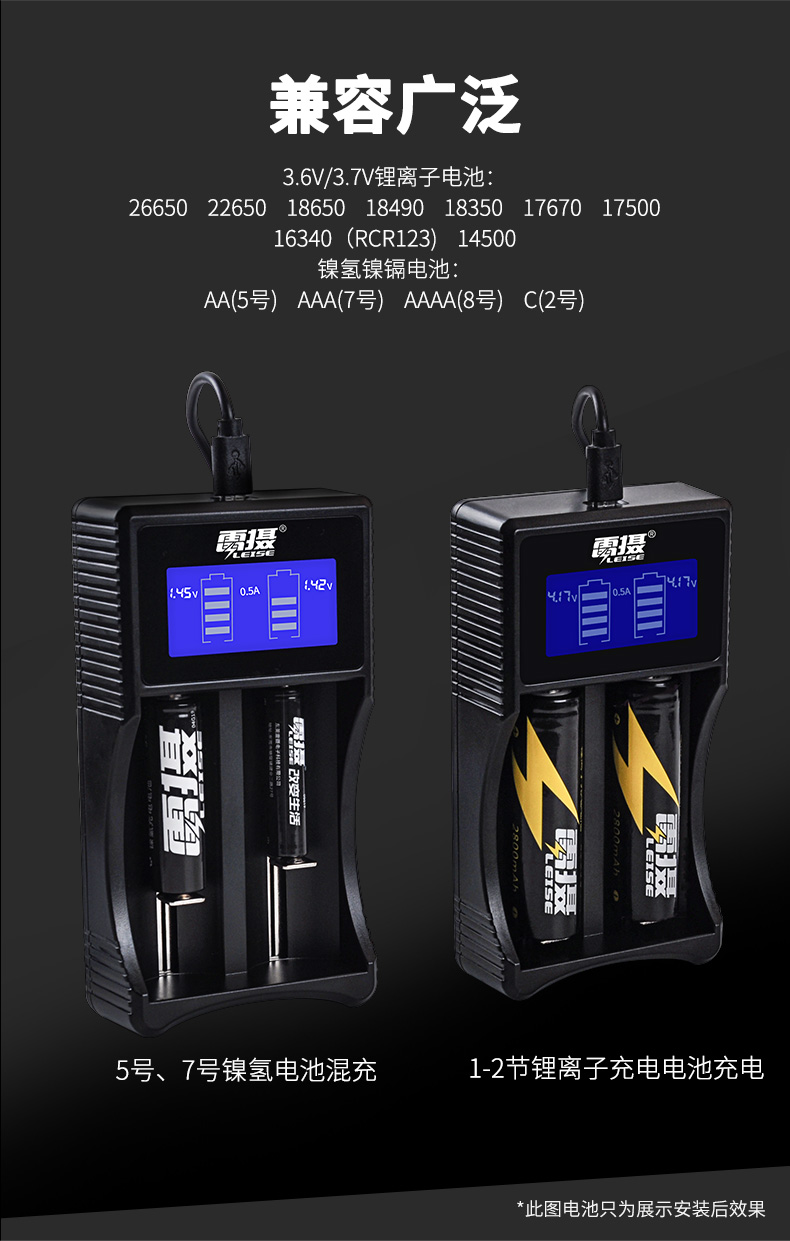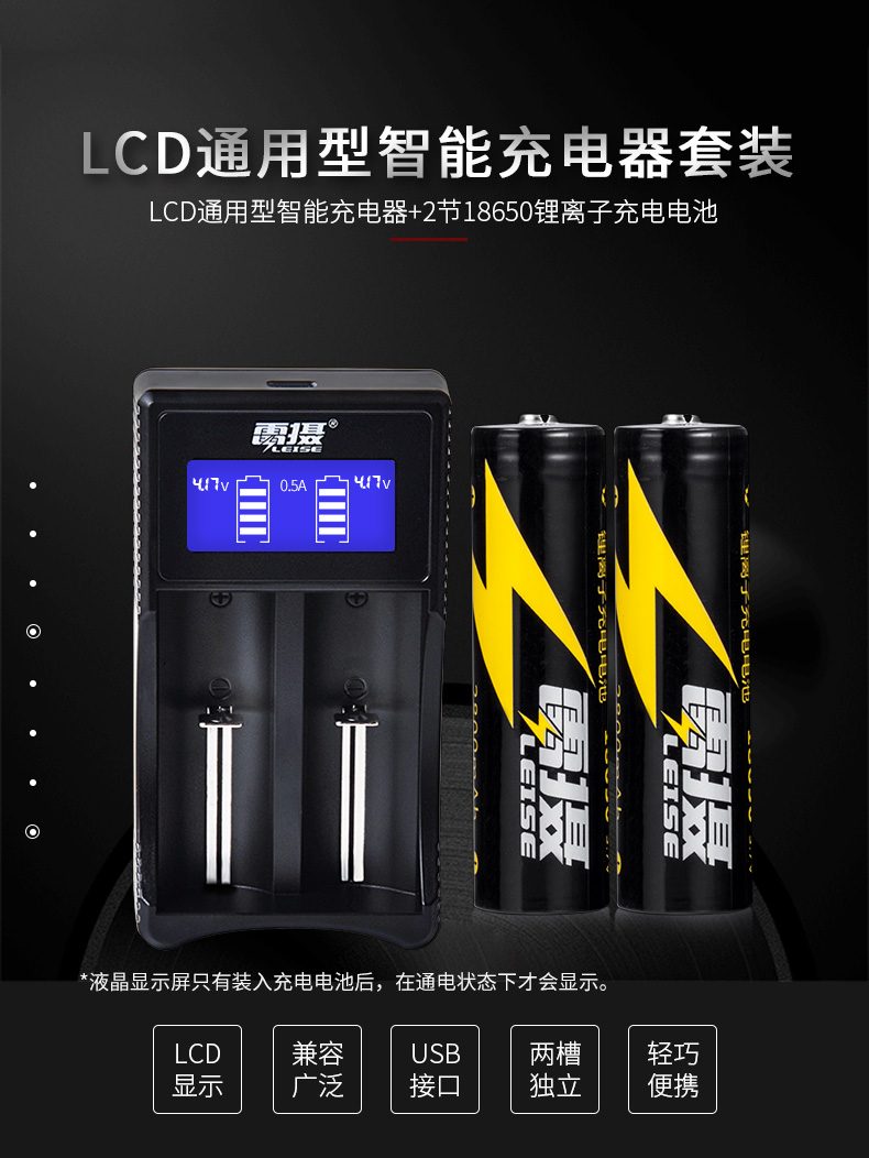 商品名称:雷摄 LEISE U218A两槽多功能锂电池充电套装(多功能充电器+2节2800mAh18650锂电电池)强光手电筒/头灯/航模 套 黑色