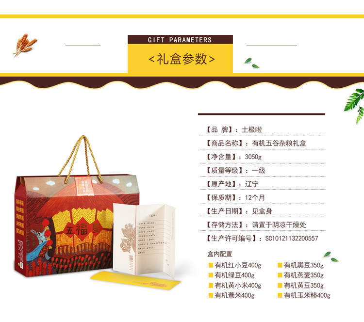 商品名称:土极啦五福星有机杂粮礼盒 8种五谷杂粮搭配 3050g/盒 图片色