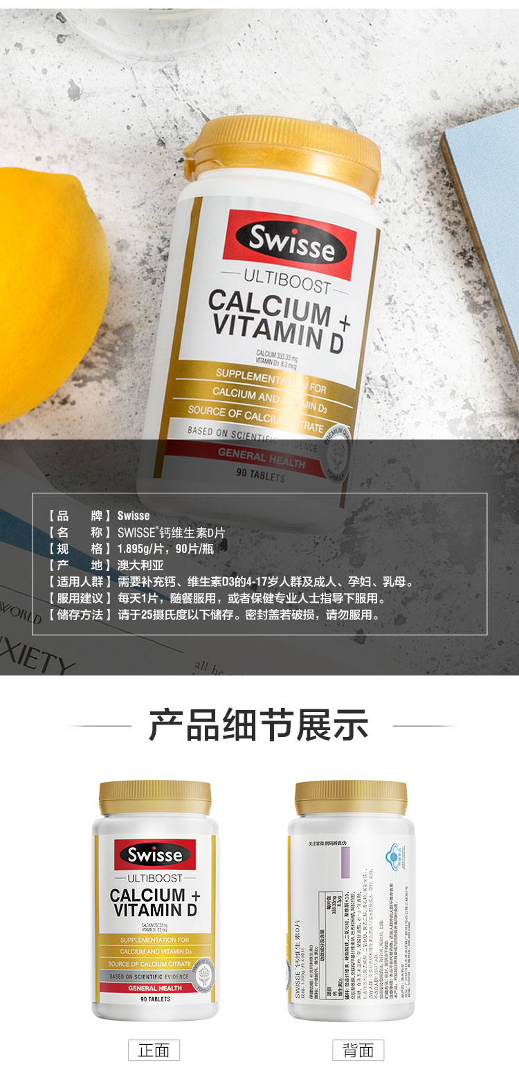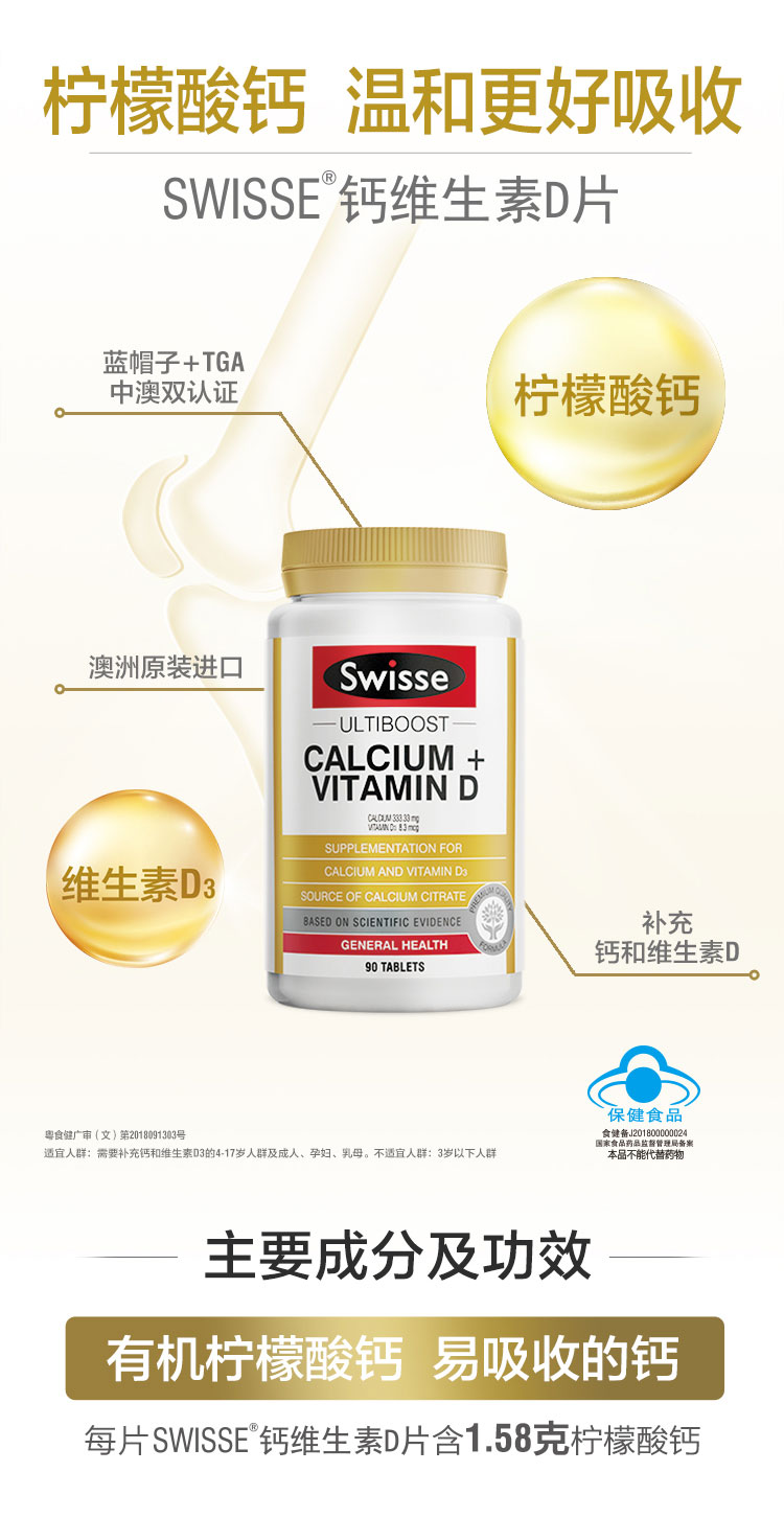 商品名称:Swisse斯维诗 钙+维生素D片 90粒 柠檬酸钙 钙片 蓝帽认证 成人补钙 海外进口 图片色 图片色