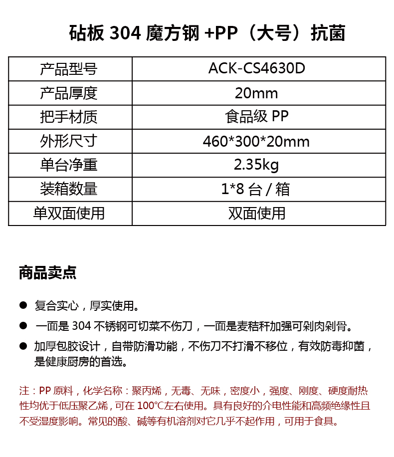 商品名称:ACA 砧板 304魔方钢+PP (大号)抗菌ACK-CS4630D 不锈钢色 不锈钢色