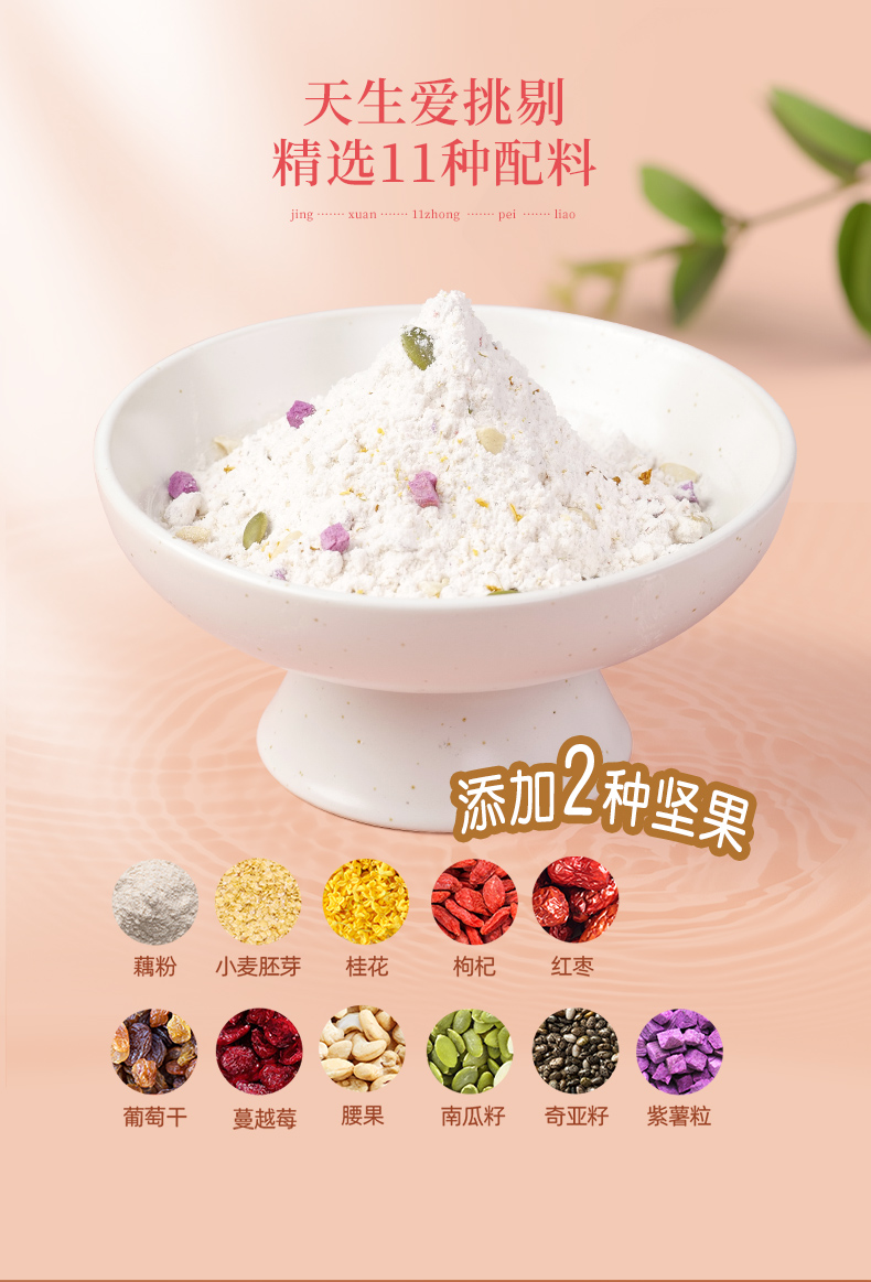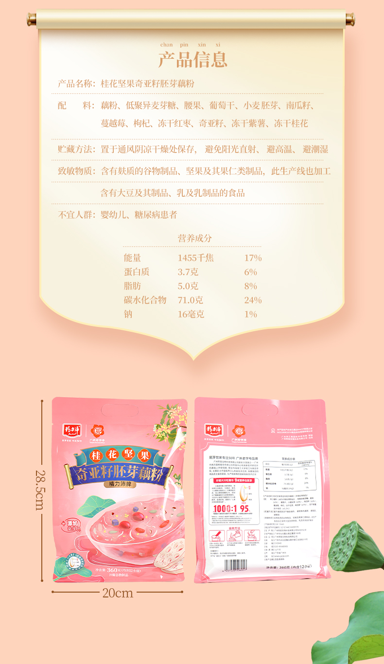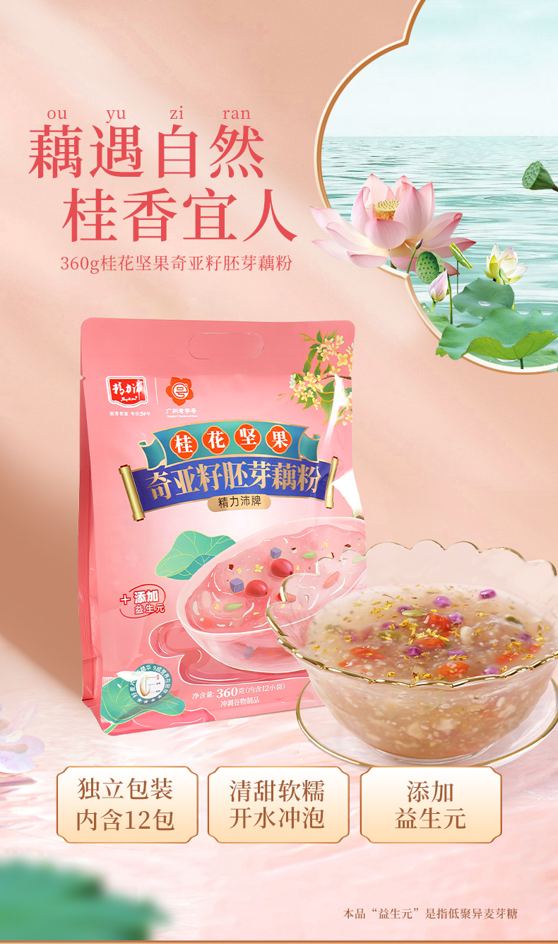 商品名称:精力沛冲即食健康营养代餐粉益生元桂花坚果奇亚籽胚芽藕粉360g*2袋 300g*2袋
