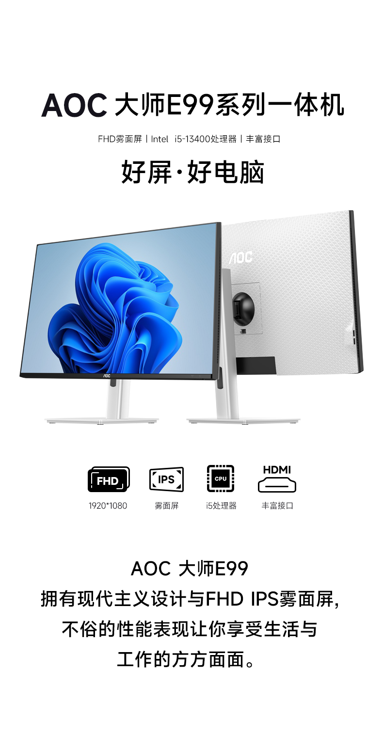 商品名称:AOC大师E99 23.8英寸一体机电脑(Intel i5-13400/32G/1T固/键鼠)(台) 银色