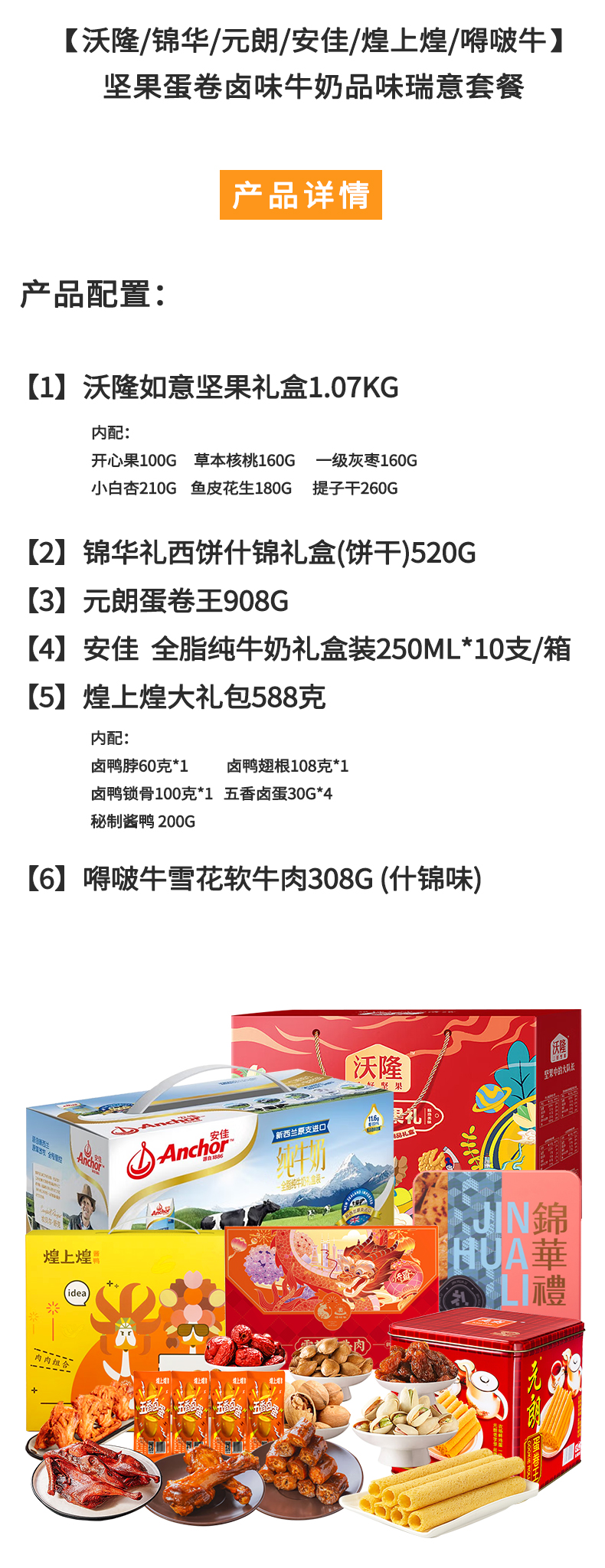 商品名称:沃隆/锦华/元朗/安佳/煌上煌/嘚啵牛-坚果蛋卷卤味牛奶品味瑞意套餐3394g+2.5L 象牙色