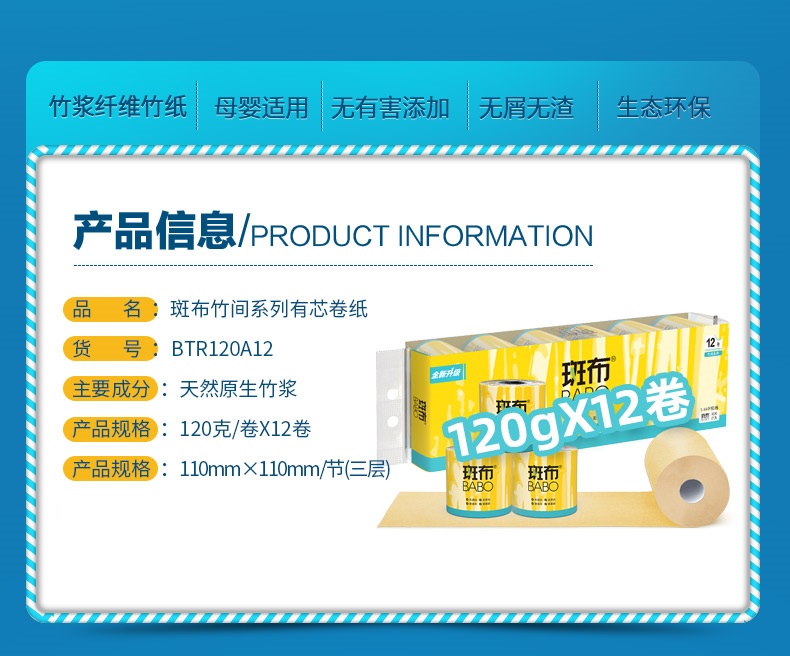 商品名称:斑布BASE Ⅱ系列有芯有膜卷纸120克*12卷 BTJ120A12 黄色