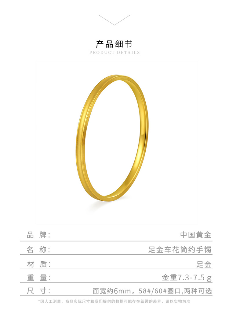 商品名称:中国黄金 黄金足金999车花简约手镯-60# ZGHJ220466-2(单位:件) 金色