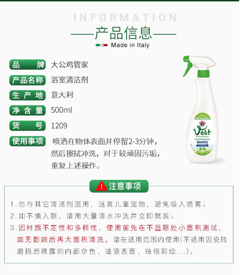 商品名称:大公鸡管家浴室瓷砖清洁剂500mll*2(单位:瓶)