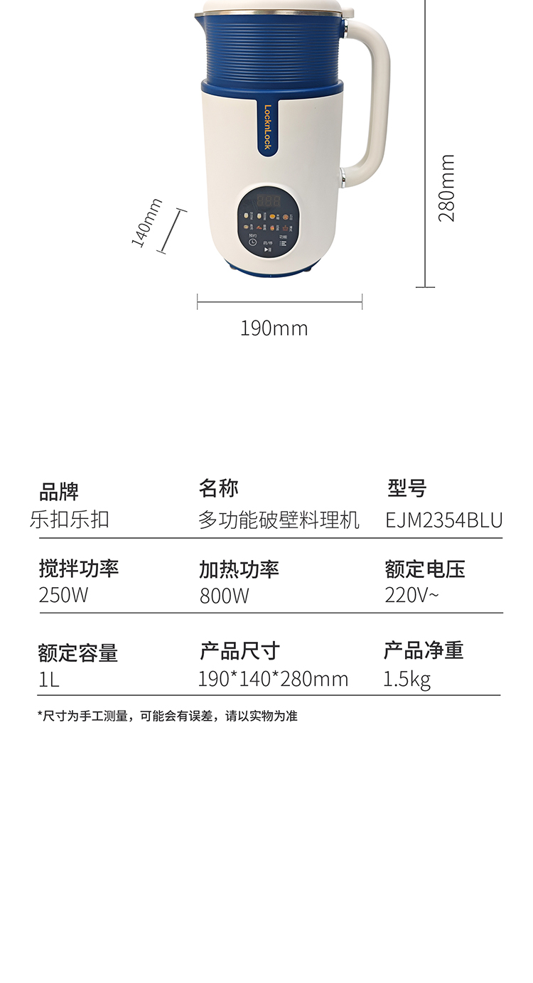 商品名称:LocknLock 多功能破壁料理机 EJM2354BLU(单位:台) 宝石蓝