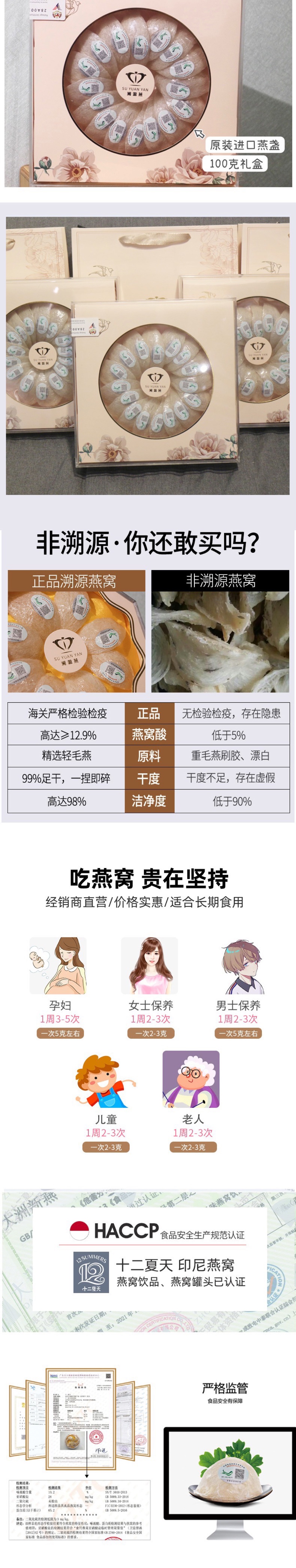 商品名称:十二夏天溯源码燕窝燕盏100g礼盒 备注:【不发货区域/加运费地区】新疆 西藏 内蒙古 港澳台不发货 自然色