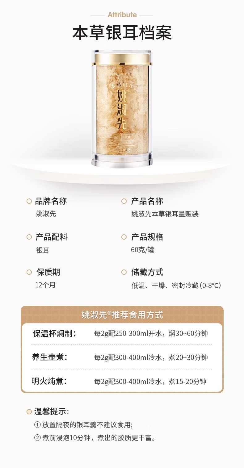 商品名称:姚淑先本草银耳60g家庭装(单位:罐) 白色