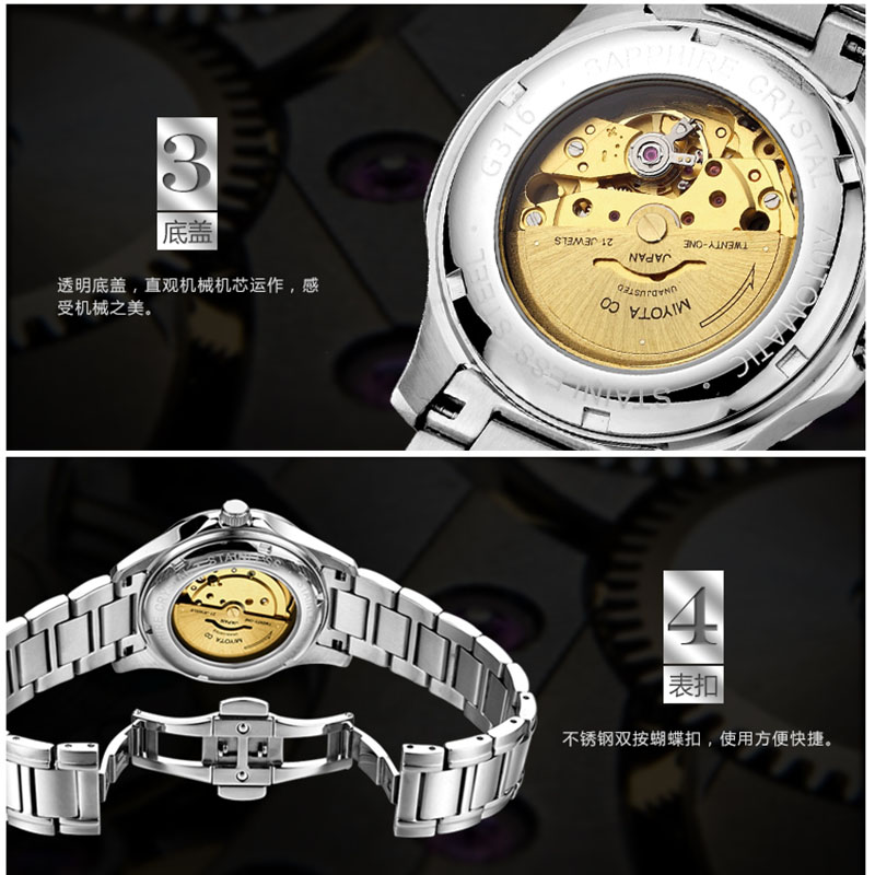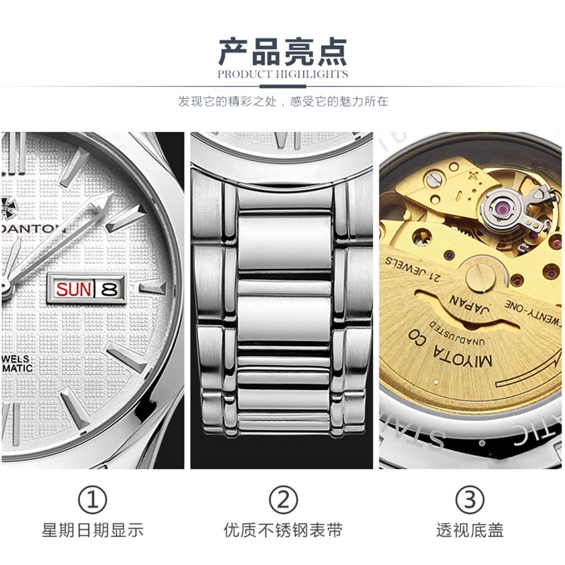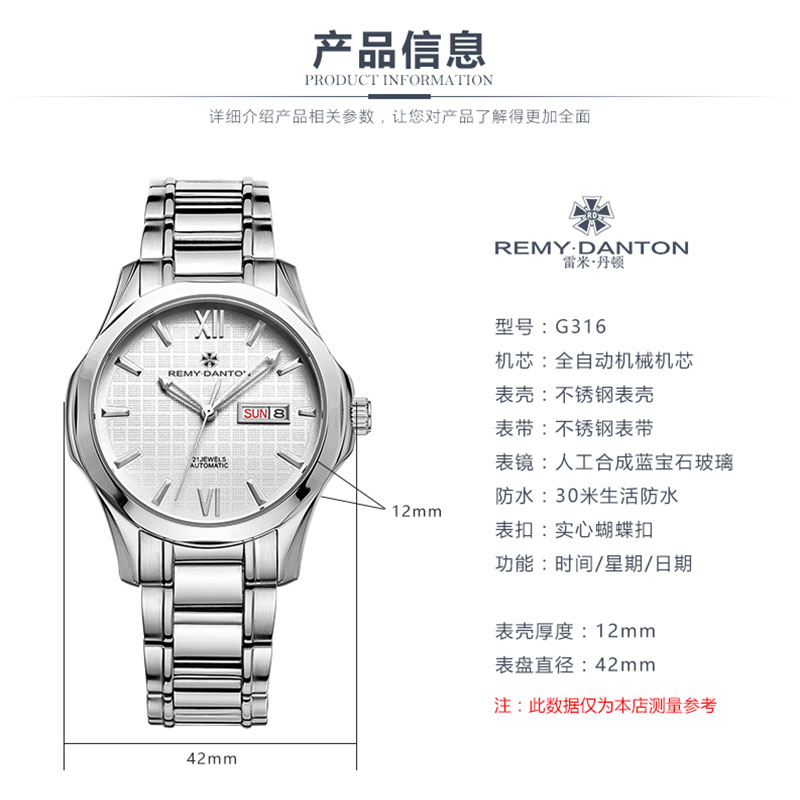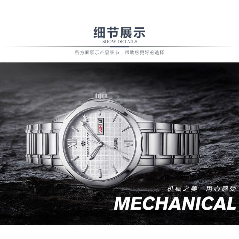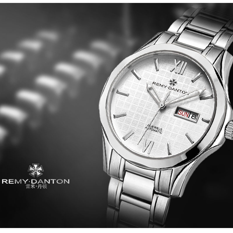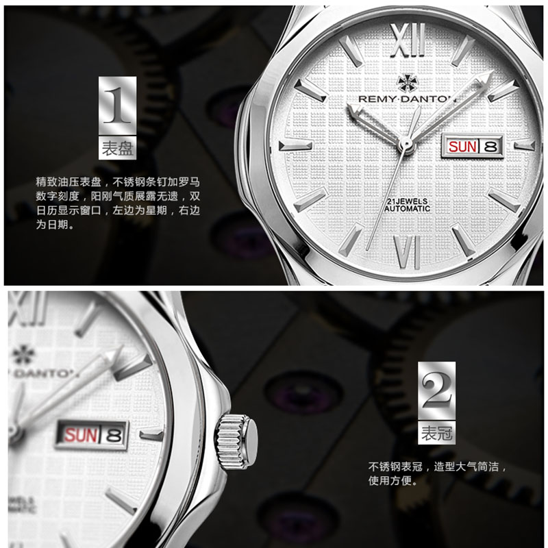 商品名称:雷米丹顿(REMY DANTON)正品夜光表全自动机械表钢带镀金男士手表防水双日历商务潮流男表 316.03金壳白面间金钢带