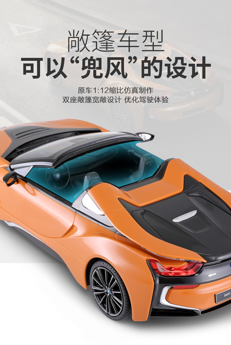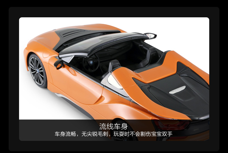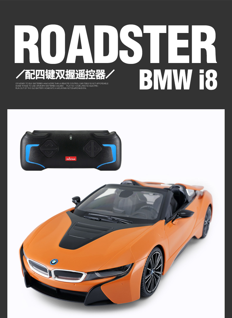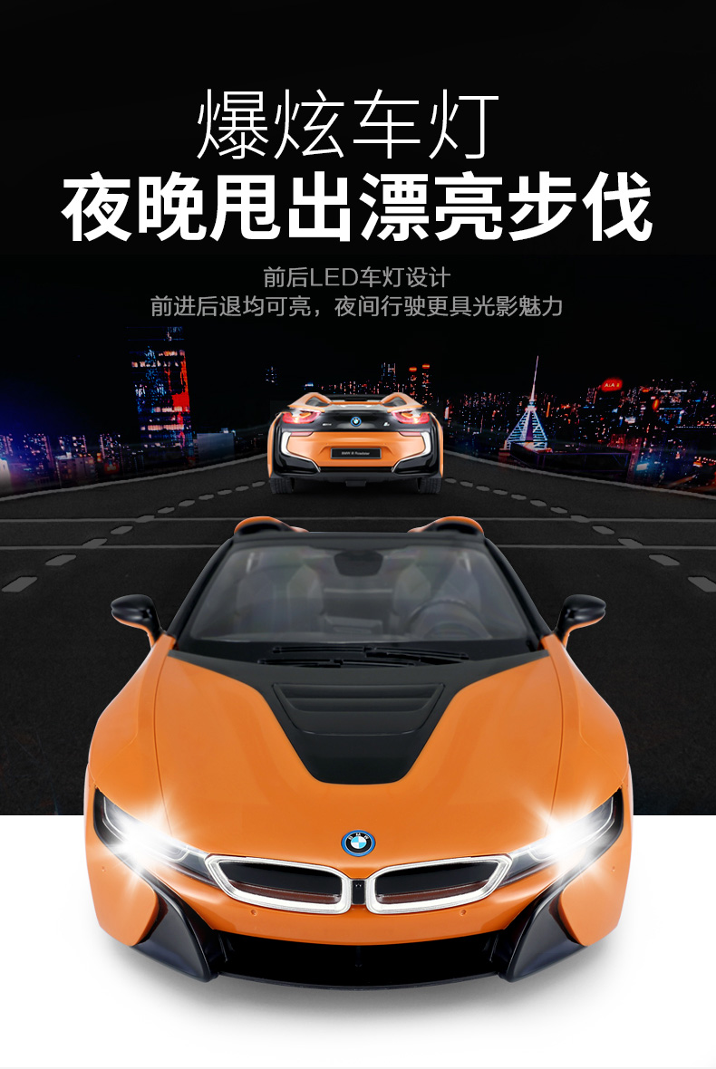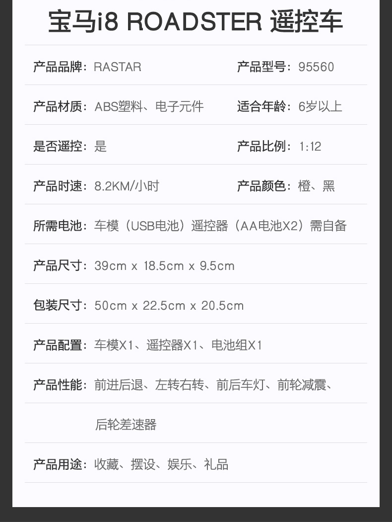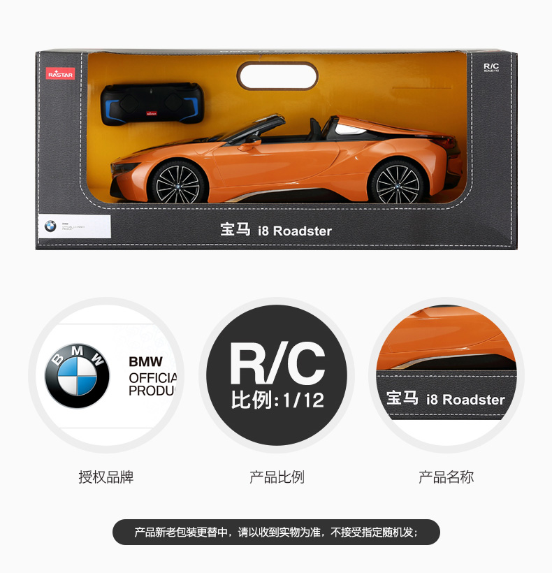商品名称:RASTAR 星辉 1:12宝马i8遥控汽车 儿童玩具车男孩敞篷跑车遥控车模型 外置充电 95560 黑/橙 随机