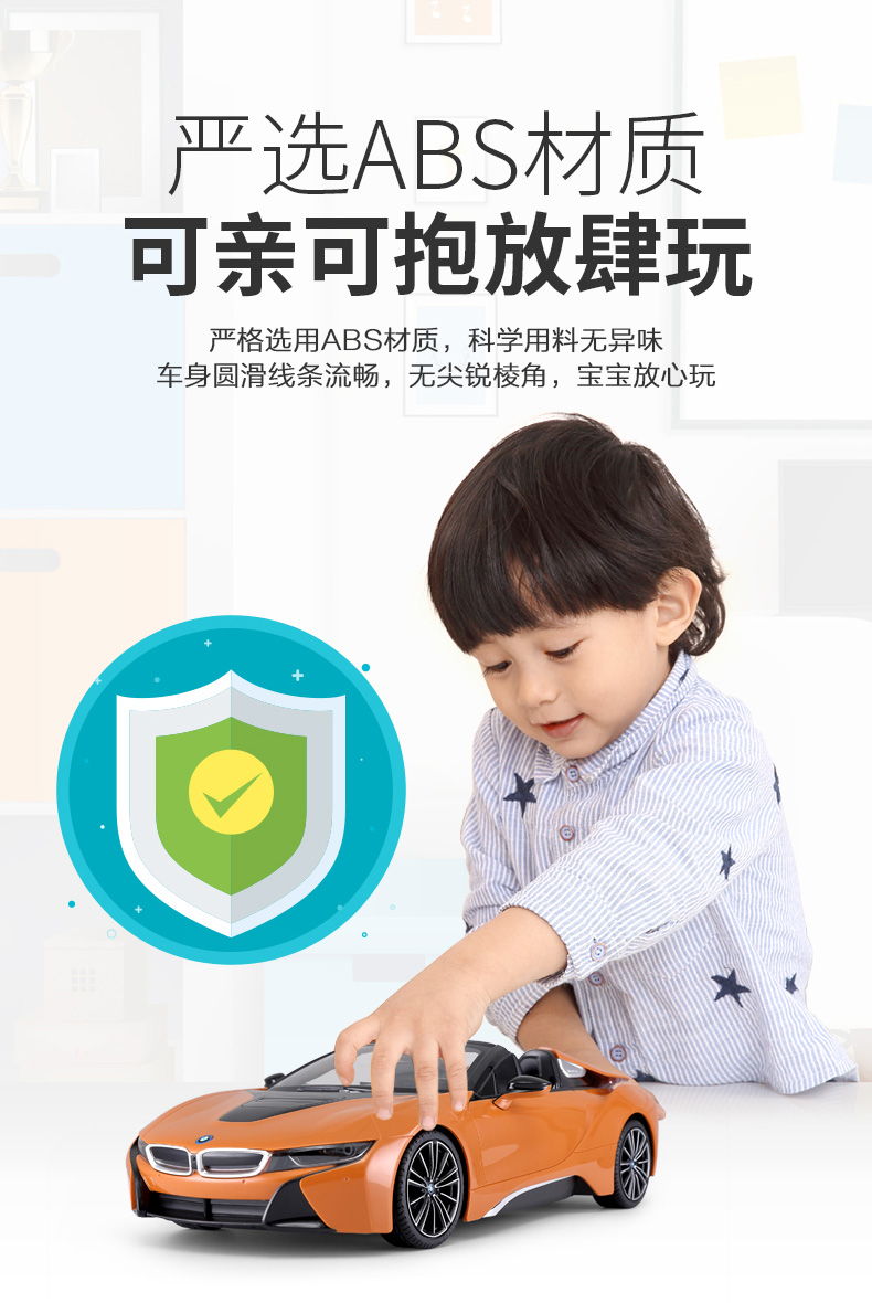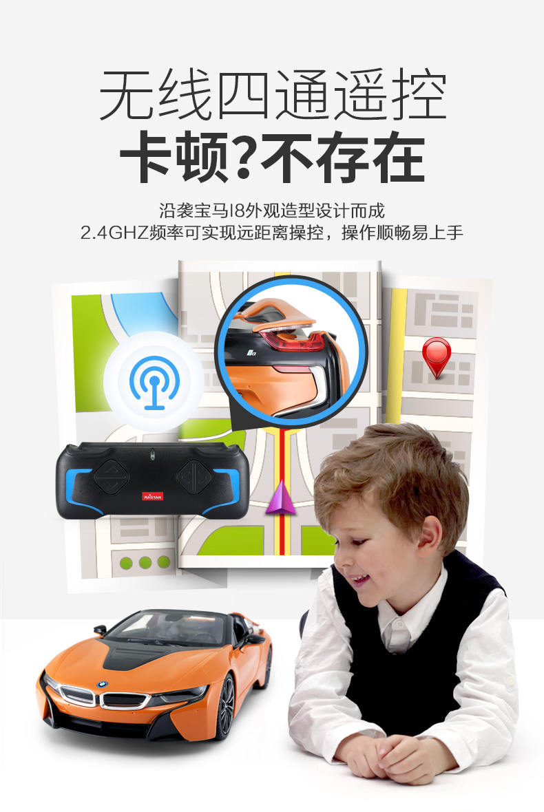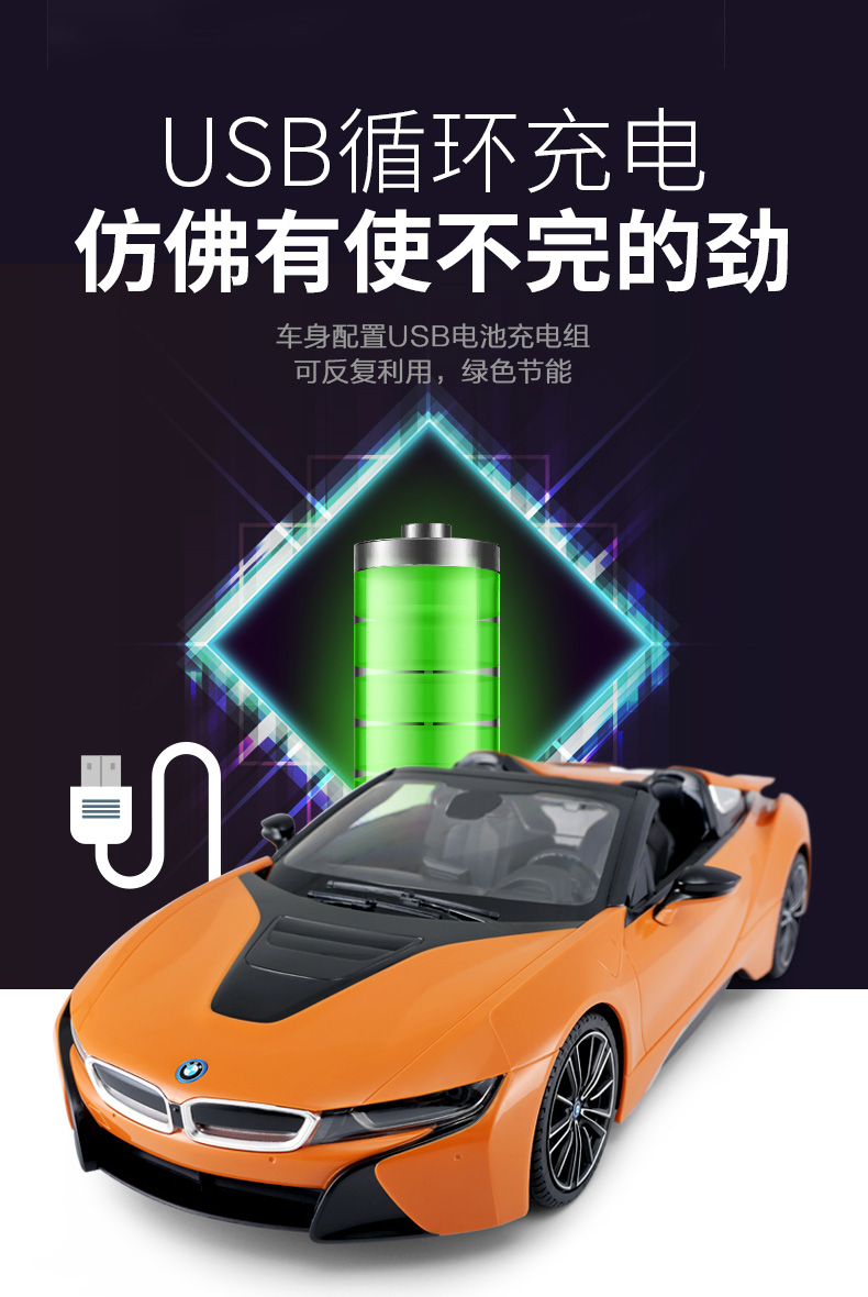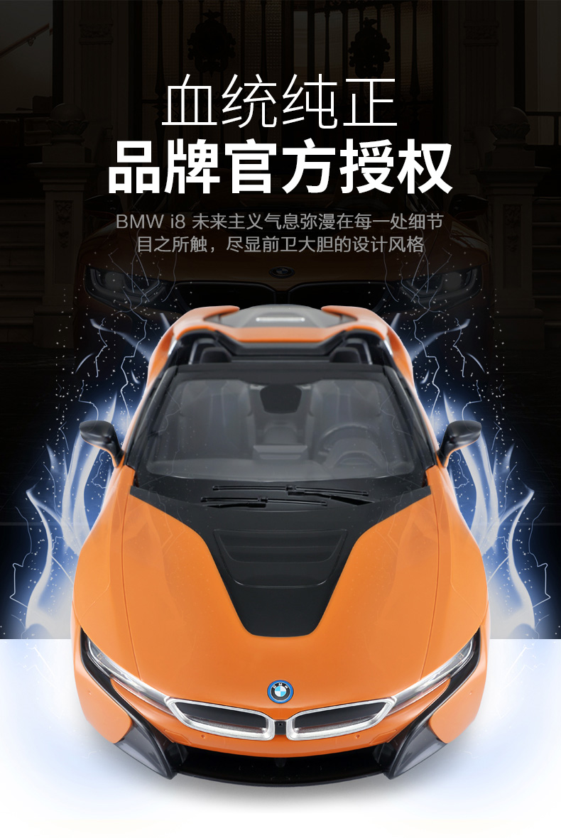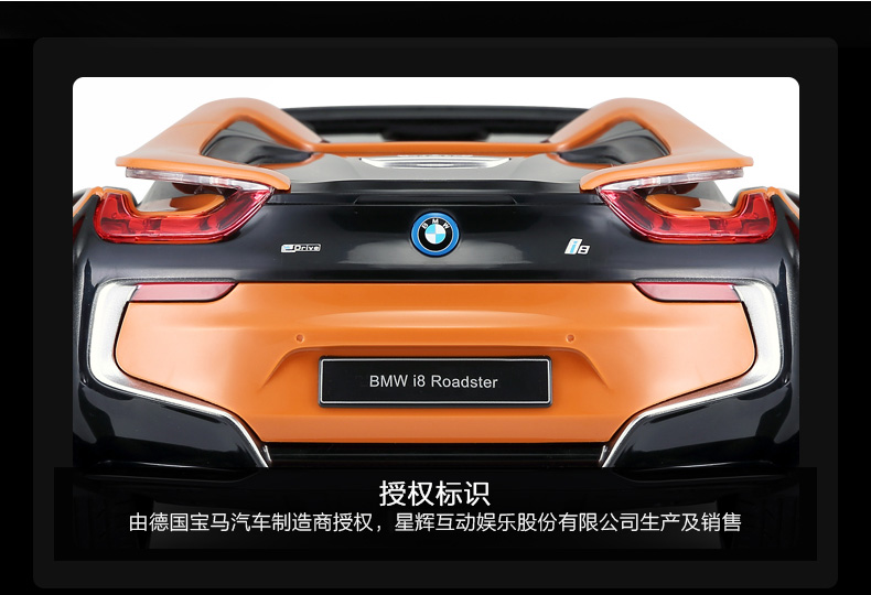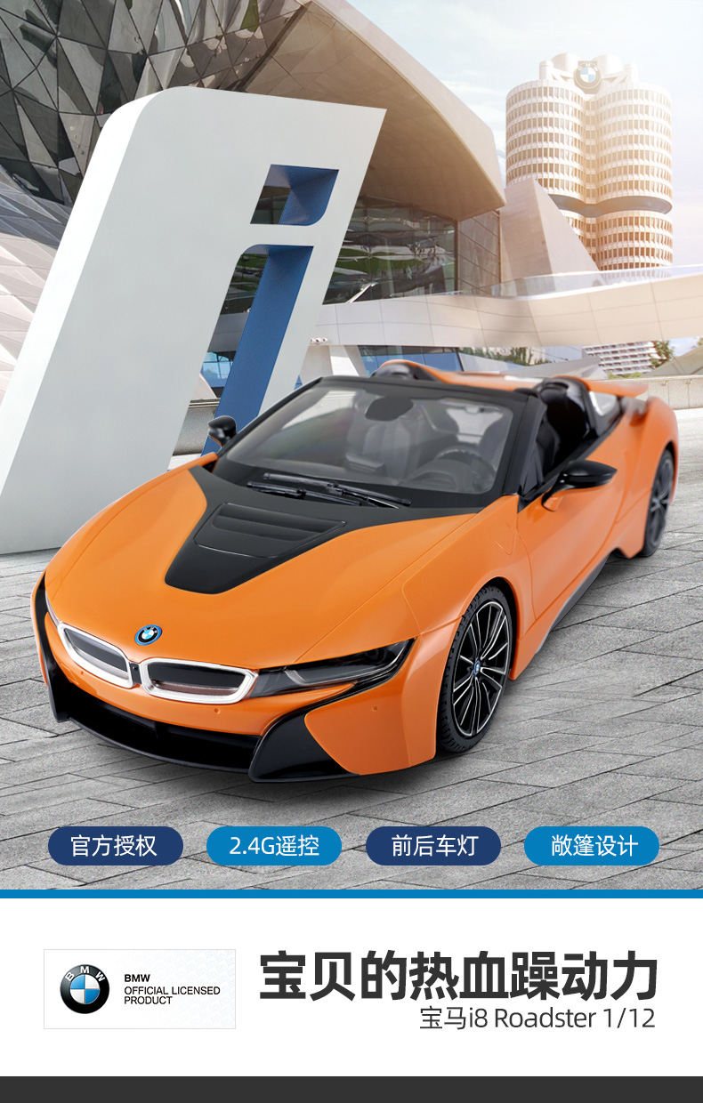 商品名称:RASTAR 星辉 1:12宝马i8遥控汽车 儿童玩具车男孩敞篷跑车遥控车模型 外置充电 95560 黑/橙 随机