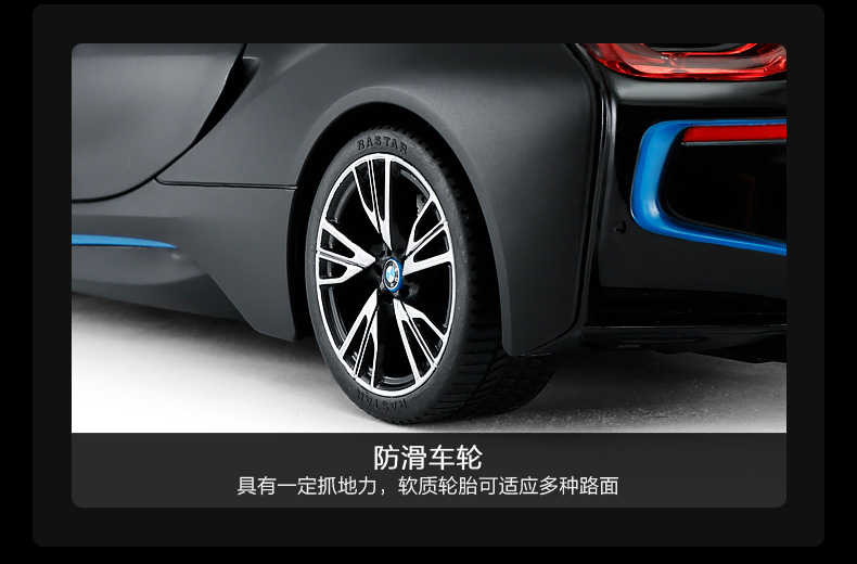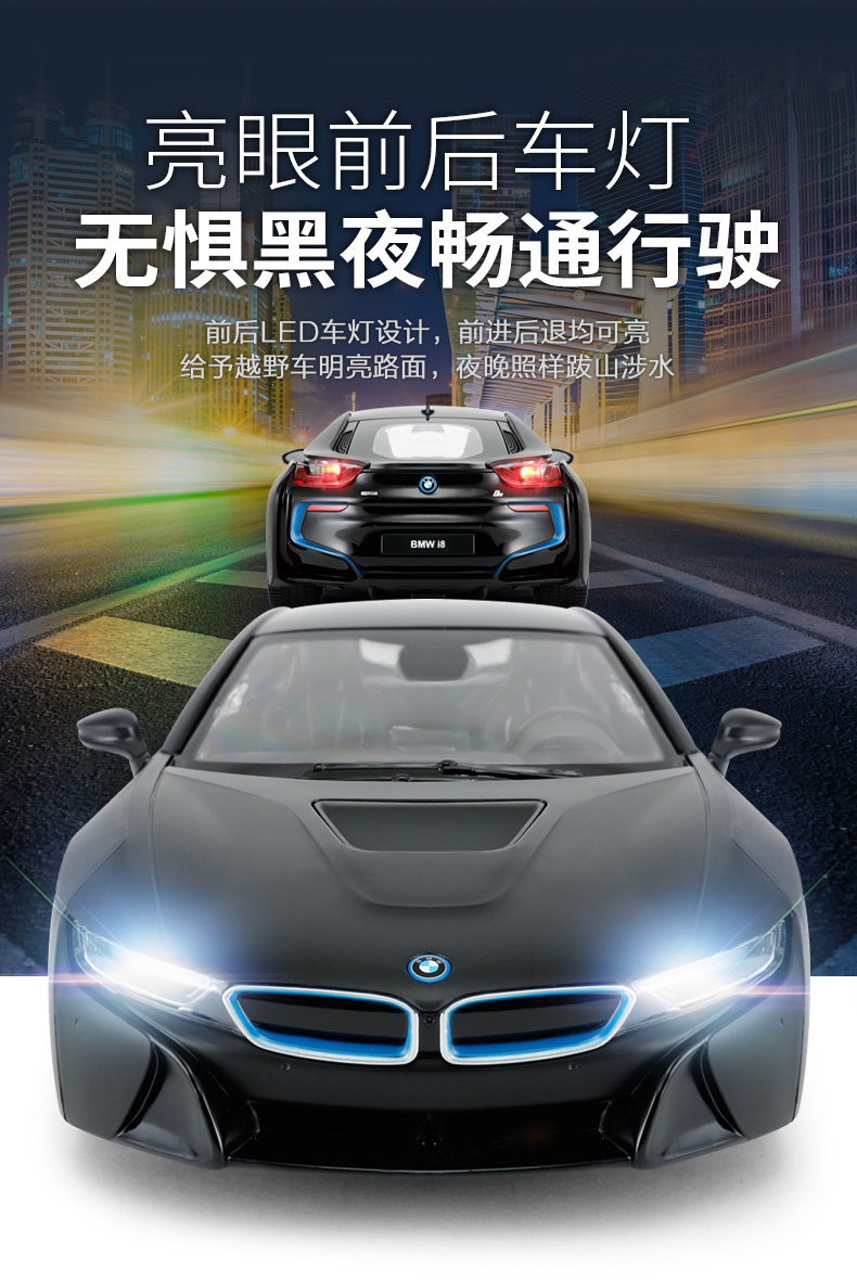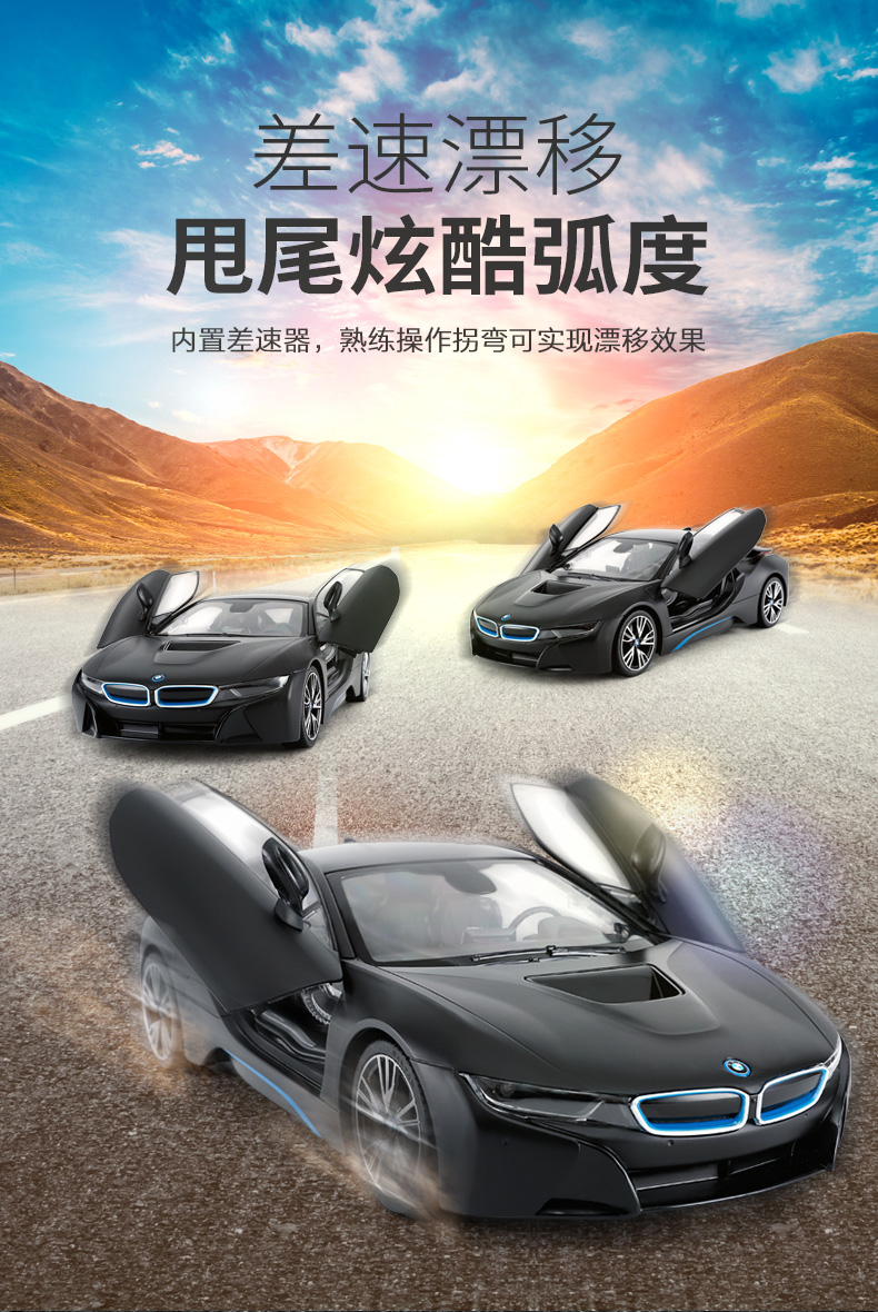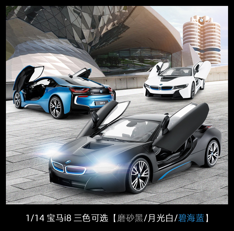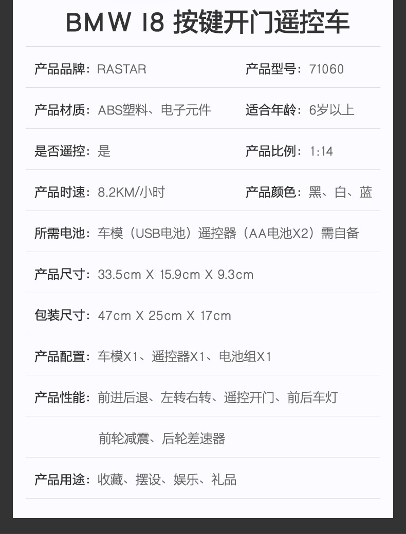 商品名称:RASTAR 星辉 1:14新宝马i8 充电遥控汽车模型 儿童玩具车单驱开门 外置充电 71060 黑/白/蓝 随机