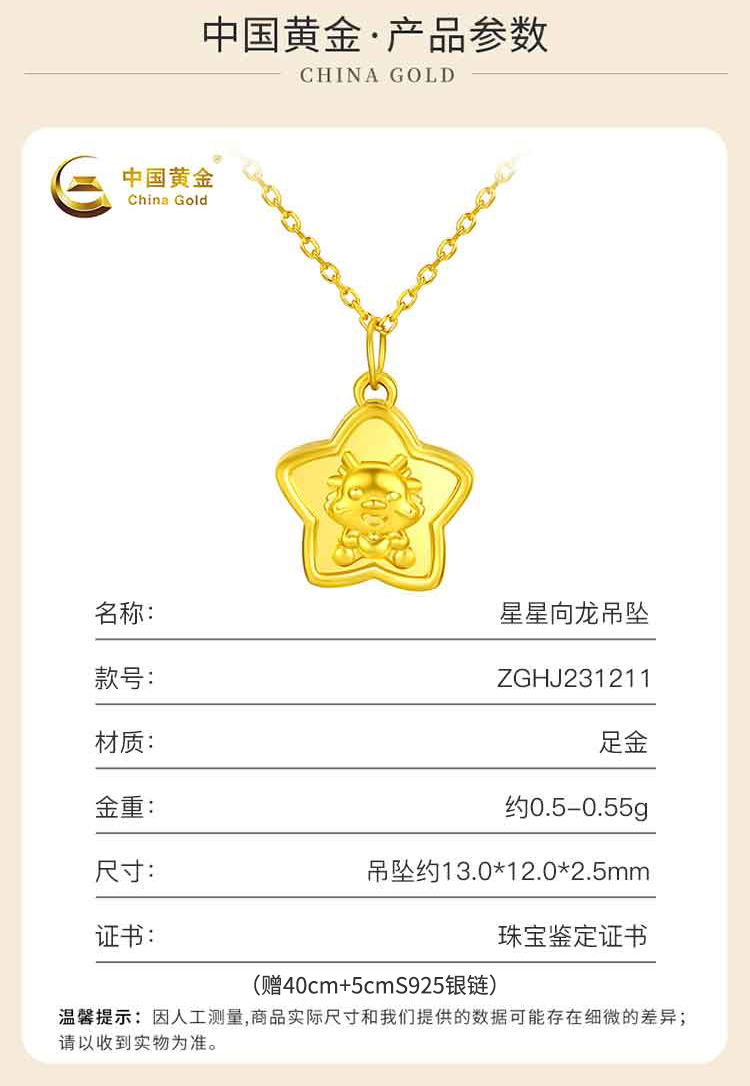 商品名称:中国黄金 足金星星向龙吊坠 ZGHJ231211 单位:件 金色