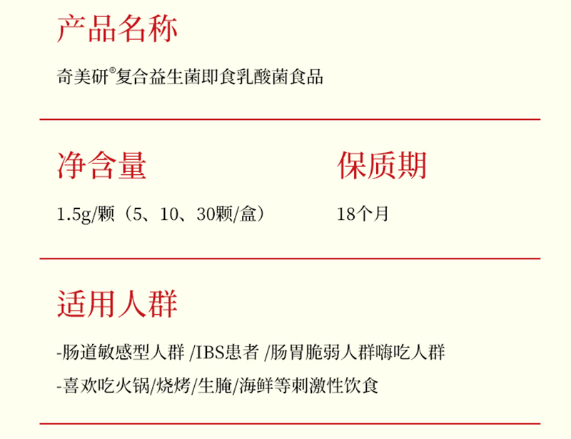 商品名称:奇美研肠敏感复合益生菌即食乳酸菌1.5g*30颗 红色