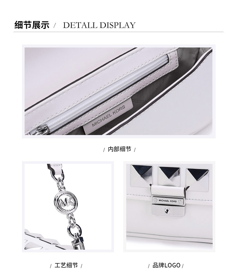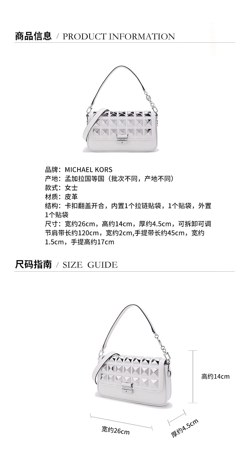 商品名称:Michael Kors 迈克·科尔斯女士BRADSHAW系列皮革铆钉装饰手提单肩斜挎包Z11100606102 光学白色