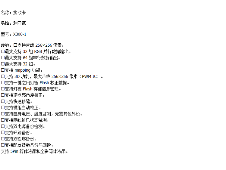 商品名称:利亚德/LEYARD 接收卡 X300-1 支持带载256*256像素 最大支持 32组RGB并行数据输出 最大支持64组串行数据输出 最大支持32扫 支持5Pin箱体液晶和全彩箱体液晶