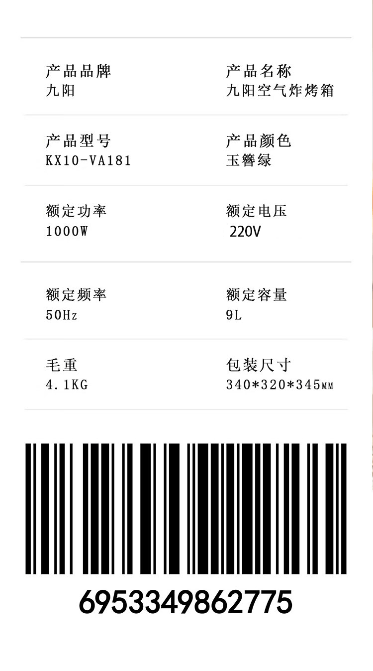 商品名称:九阳 KX10-VA181空气炸烤箱