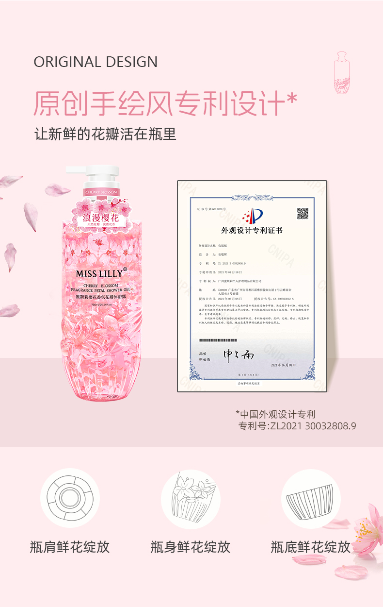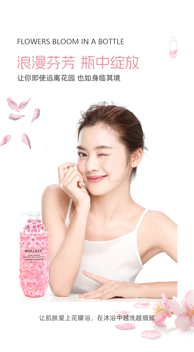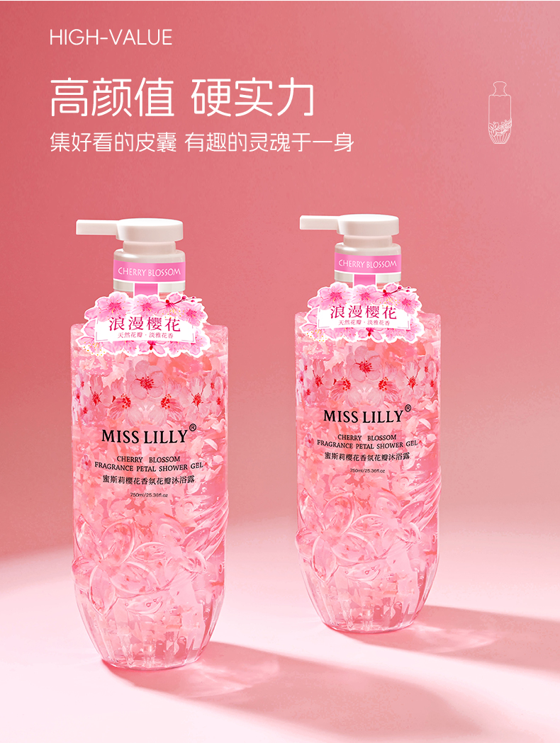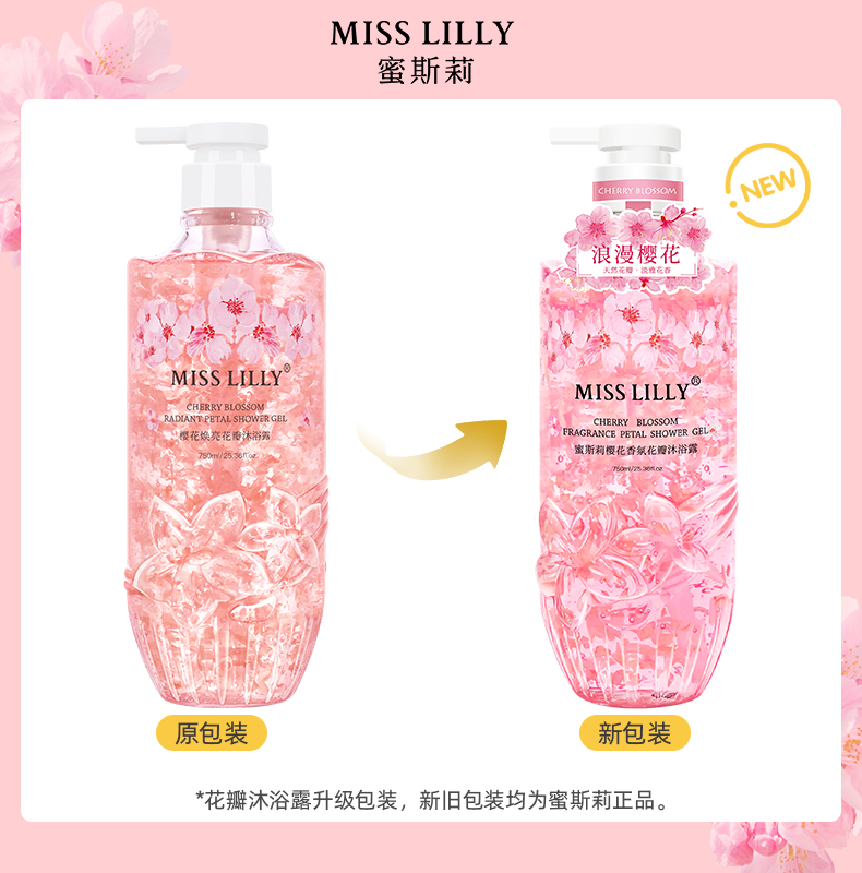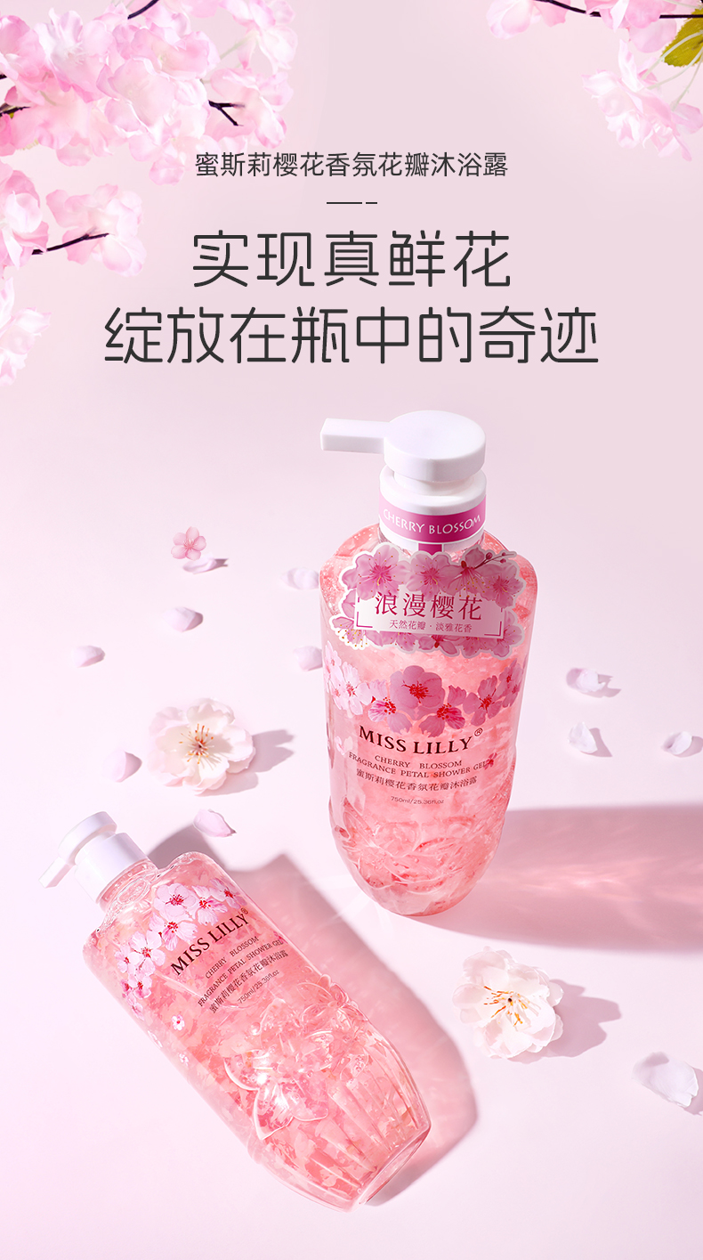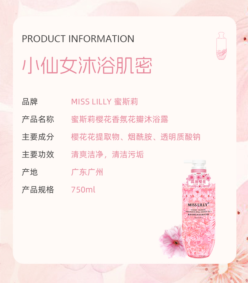 商品名称:蜜斯莉 MISS LILLY 滋润保湿持久留香沐浴露 樱花香氛花瓣 750ml 粉色(单位:瓶)