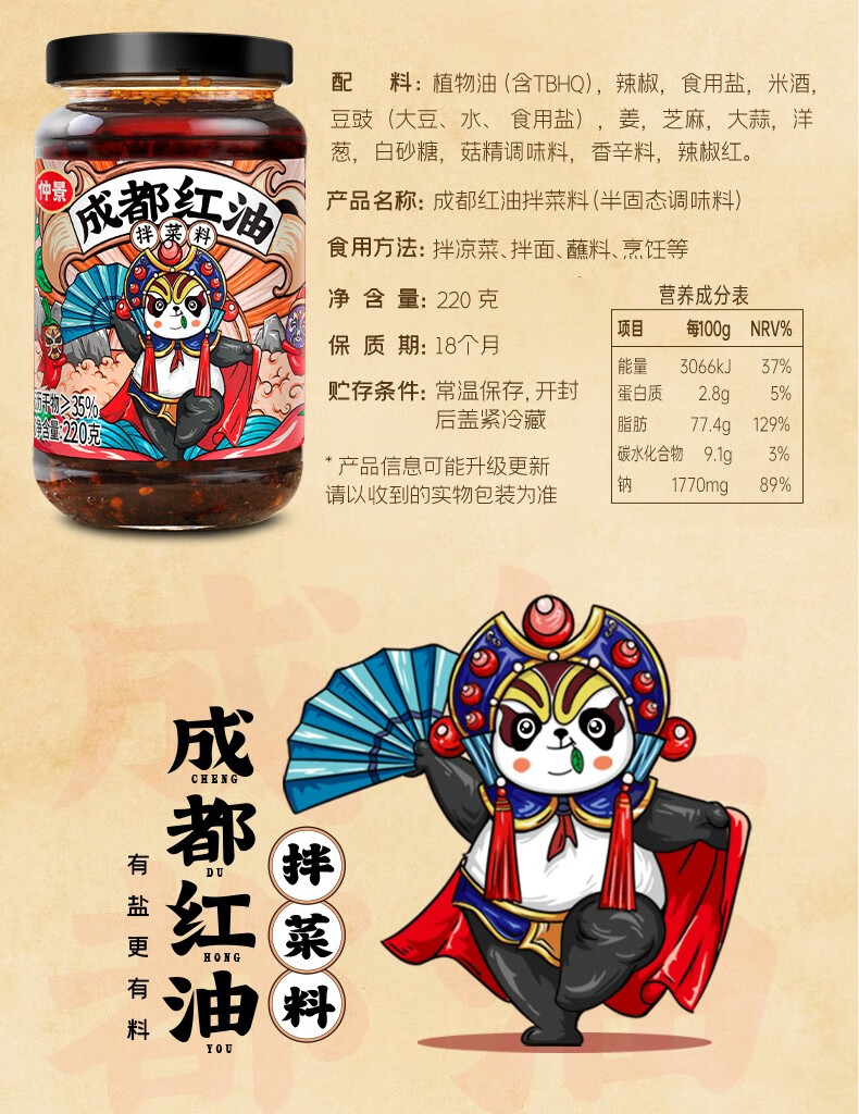 商品名称:仲景成都红油220g*2单位:瓶 220g*2瓶