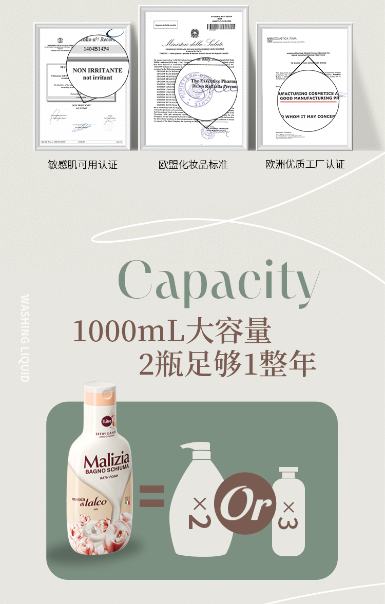 商品名称:意大利玛莉吉亚沐浴露持久留香保湿滋润香氛1L(单位:瓶) 木质香味