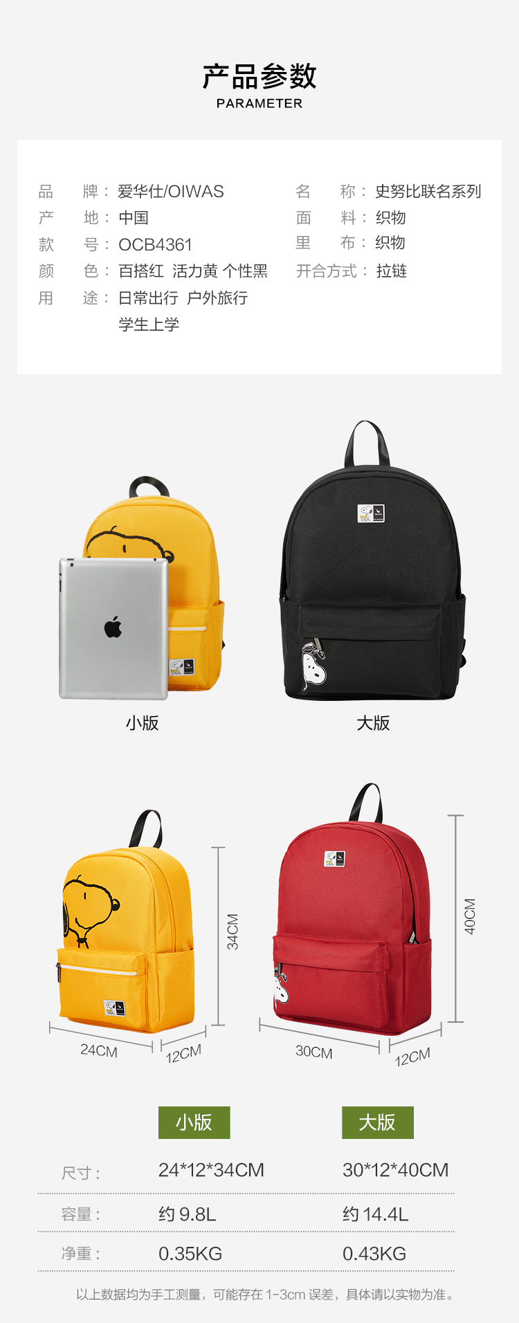 商品名称:爱华仕(OIWAS)史努比70周年联名背包小版OCB4361S(单位:个) 黑色
