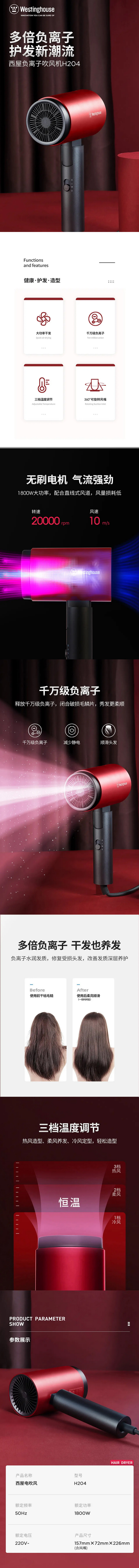 商品名称:西屋(Westinghouse)电吹风家用负离子护发吹风机大功率大风力风筒H204 /台 红色