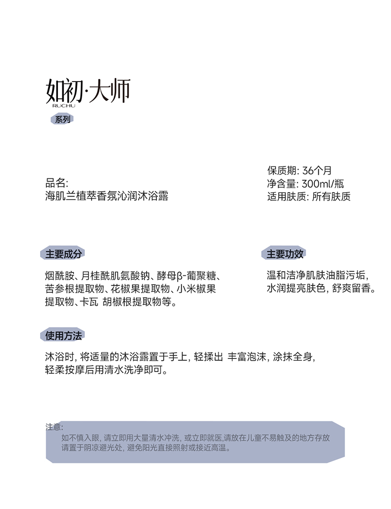 商品名称:海肌兰植萃香氛沁润沐浴露(雅柔)300ml-如初1代系列(单位:瓶) 白色