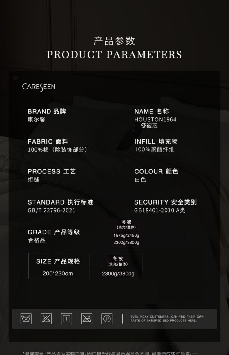 商品名称:康尔馨(Canasin)Houston1964A类抗菌纤维加厚冬被2300g(条)200*230cm 白色 200*230CM