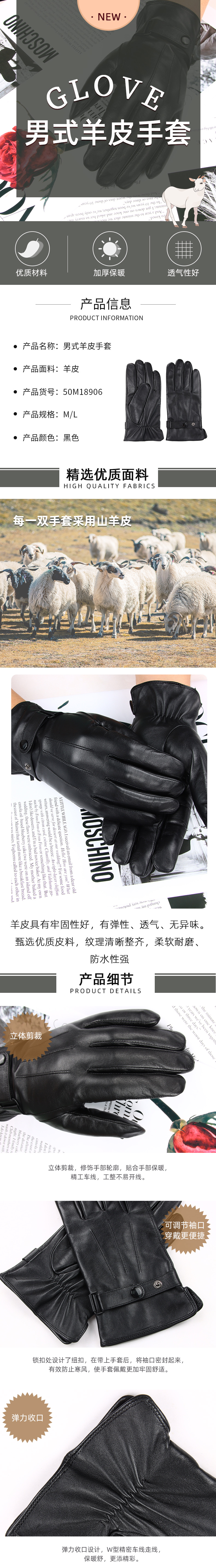 商品名称:恒源祥男式羊皮手套50M18906 黑色-L