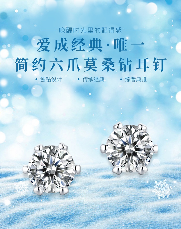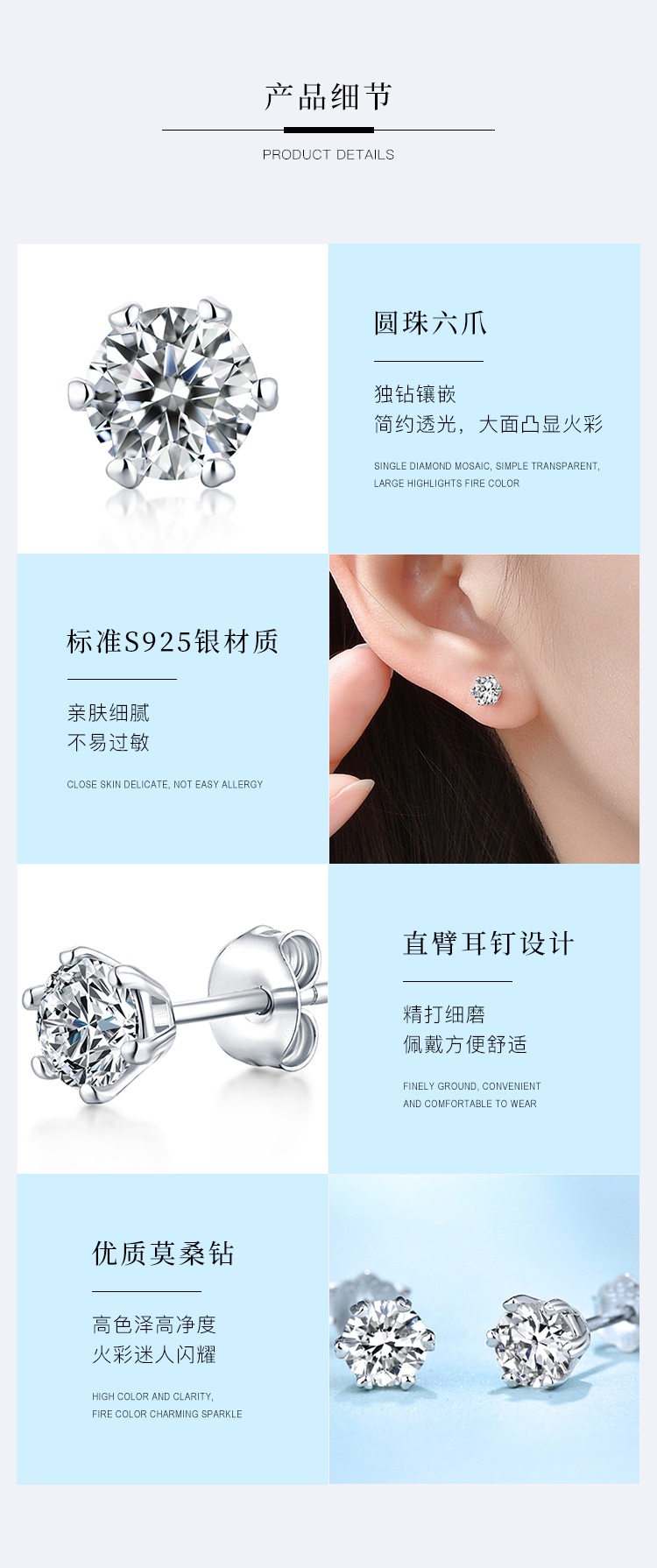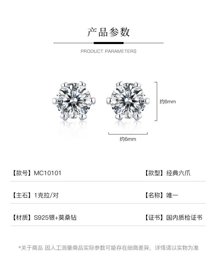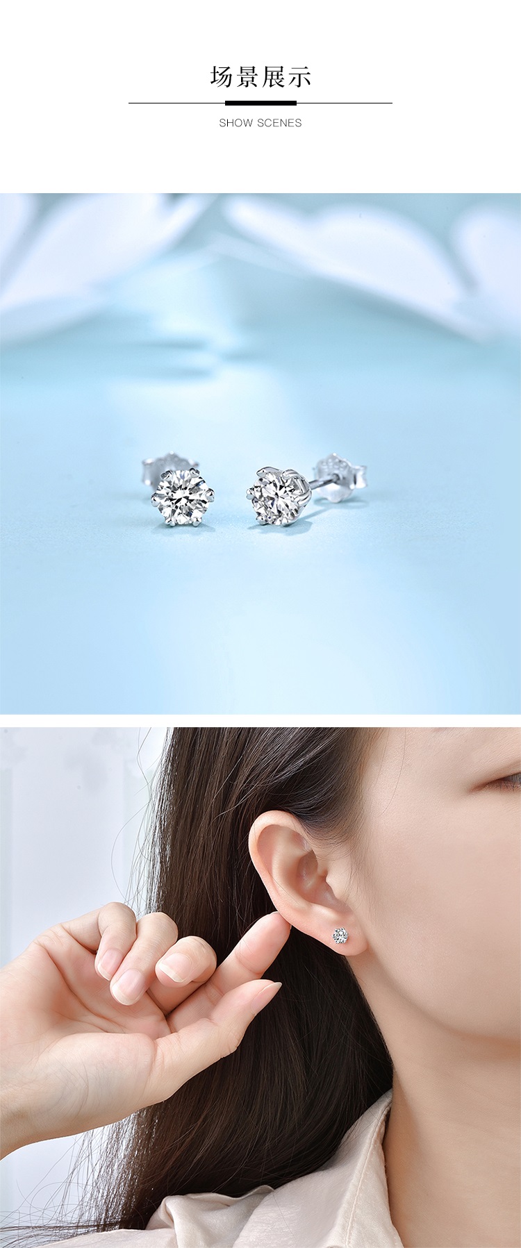 商品名称:香港HKGOLD 一克拉银镶莫桑钻耳钉S925经典六爪MC10101 银色