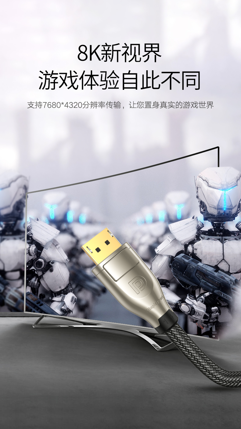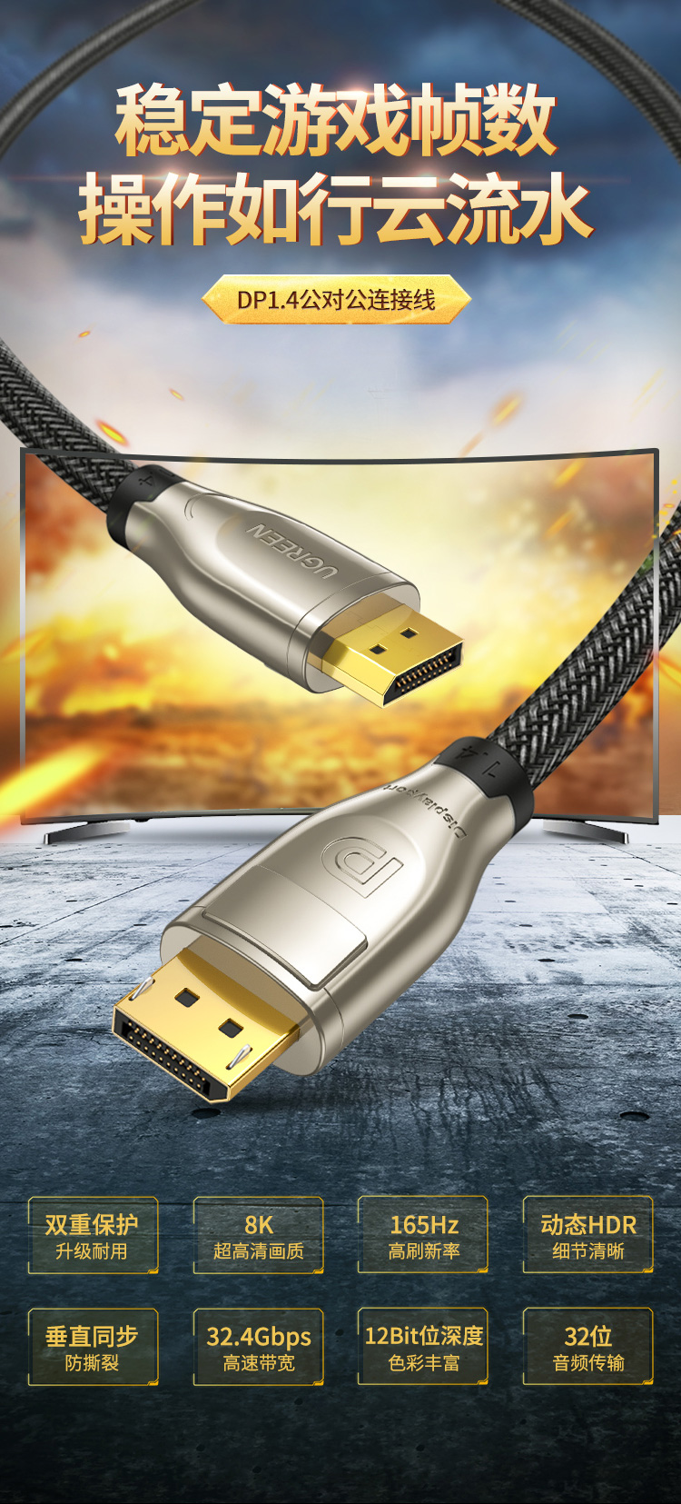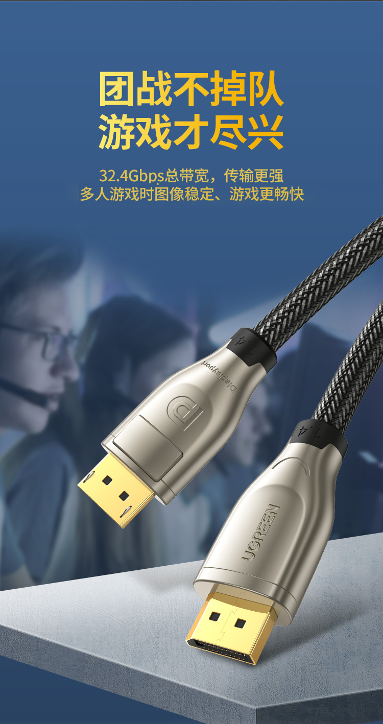 商品名称:绿联 DP线1.4版4K144Hz 2K165Hz 8K高清DisplayPort公对公连接线电脑游戏电竞显示器视频线 2米 60843 混色