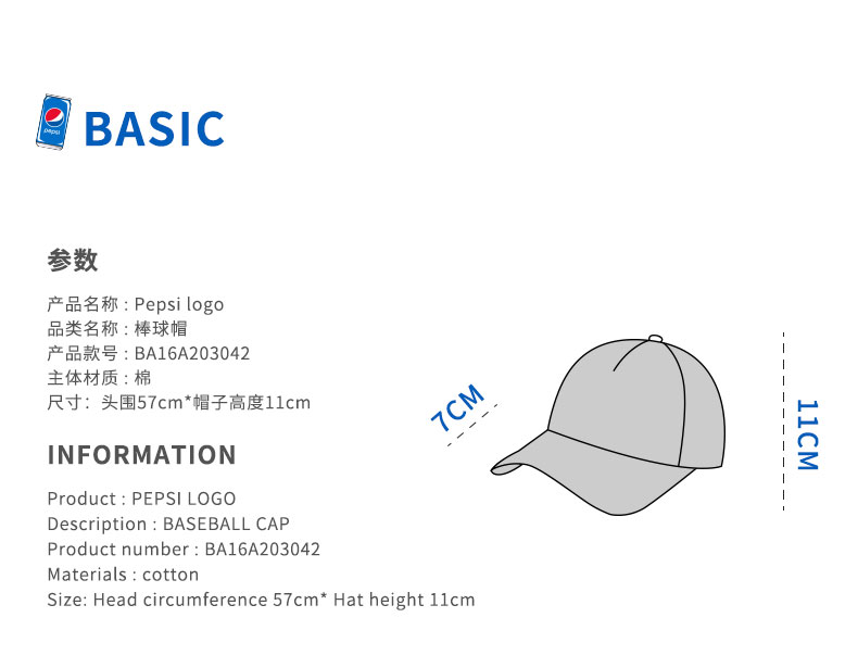 商品名称:PEPSI百事BA16A203042休闲黑色刺绣Pepsi logo棒球帽 单位:件 黑色