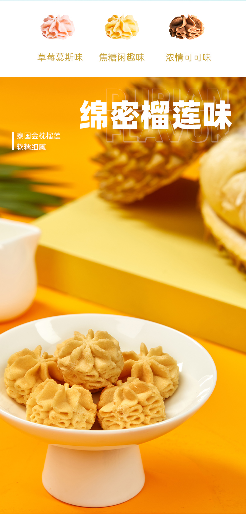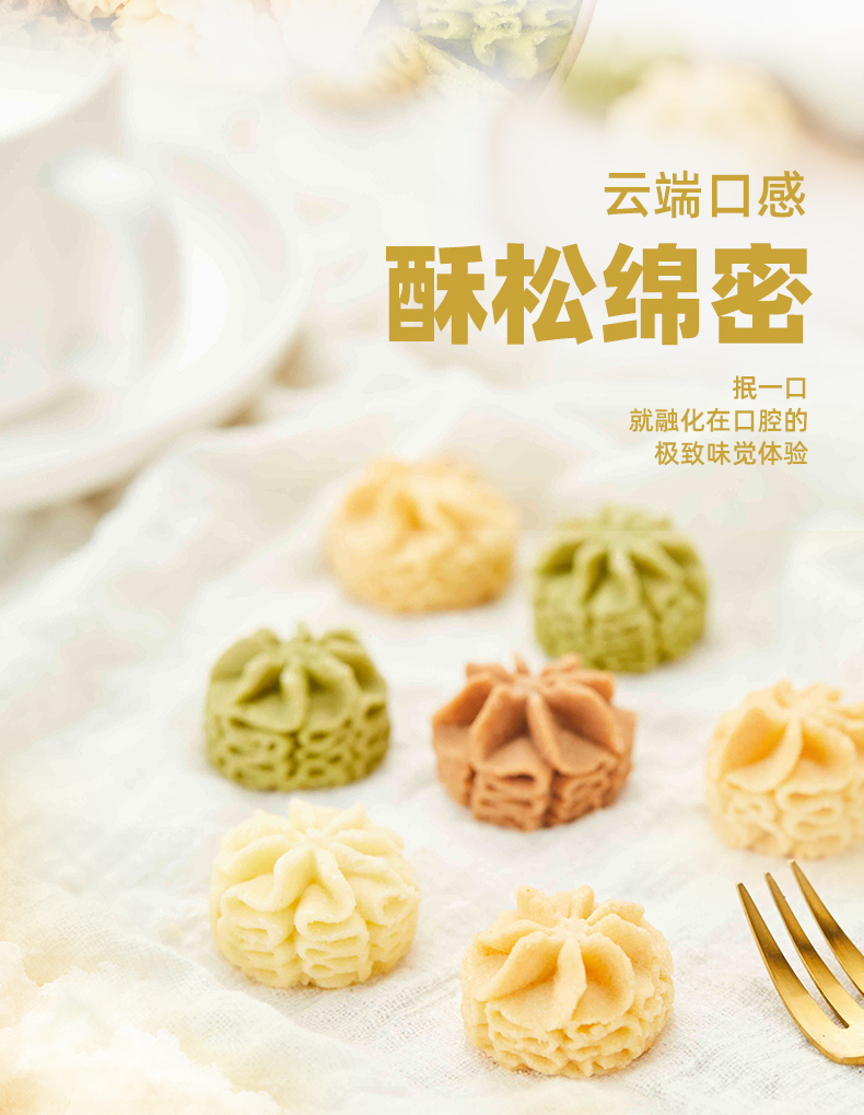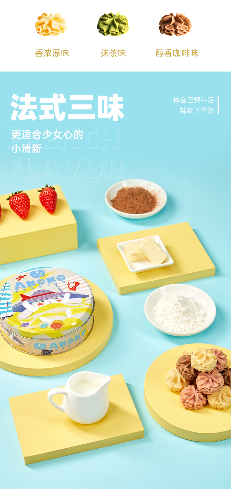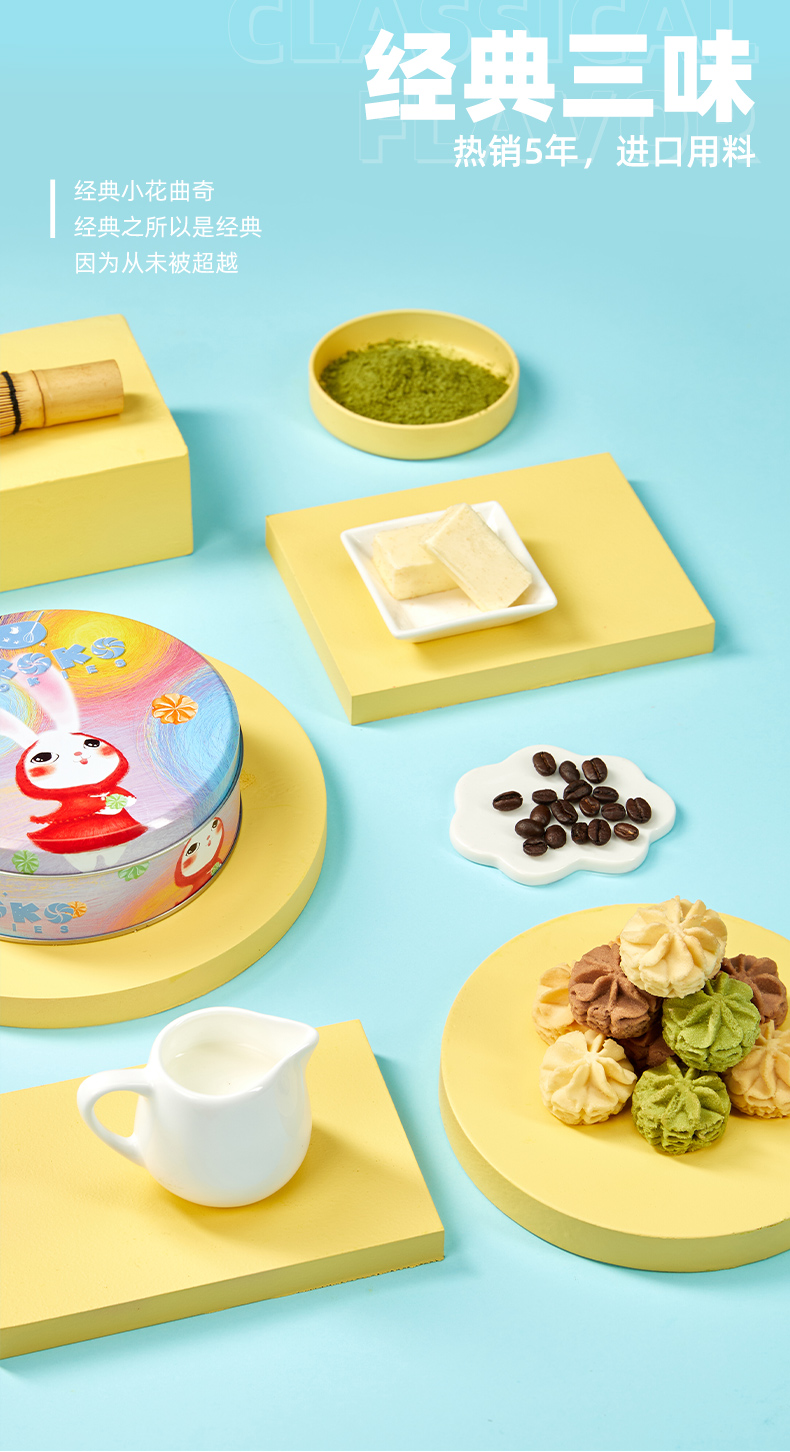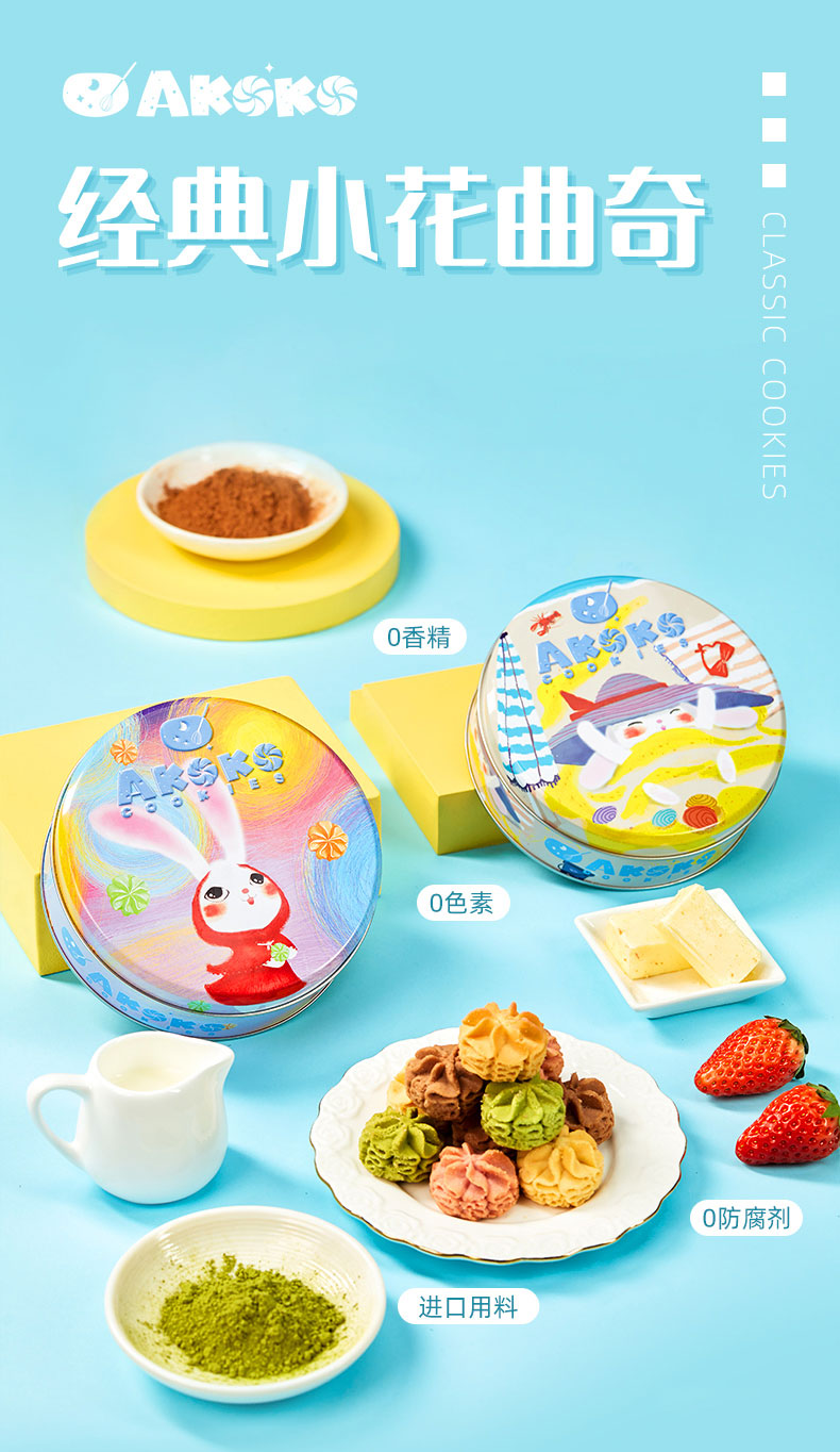商品名称:AKOKO经典小花曲奇160g/盒 法式三拼(草莓味+焦糖味+可可味) 拿铁色