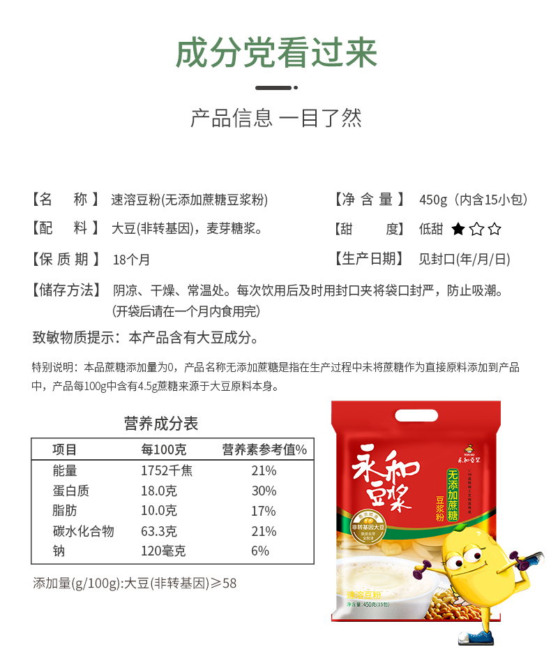 商品名称:永和豆浆无添加蔗糖豆浆粉450g/15小包(单位:袋)