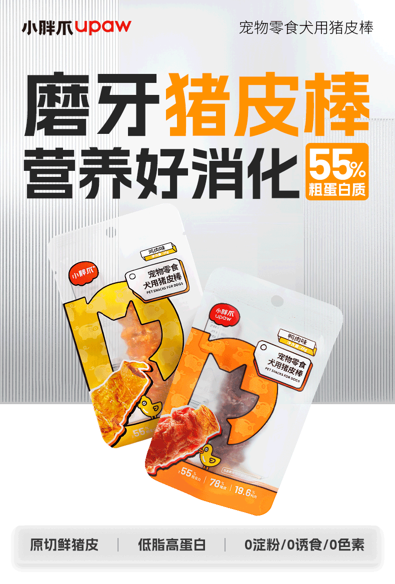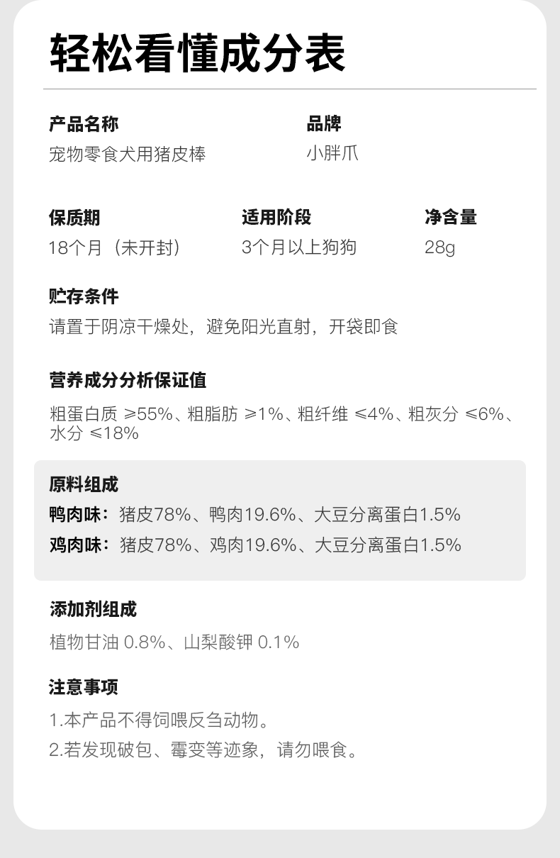 商品名称:小胖爪 猪皮棒(鸭肉味)狗狗零食28g*20(单位:袋) 自然色